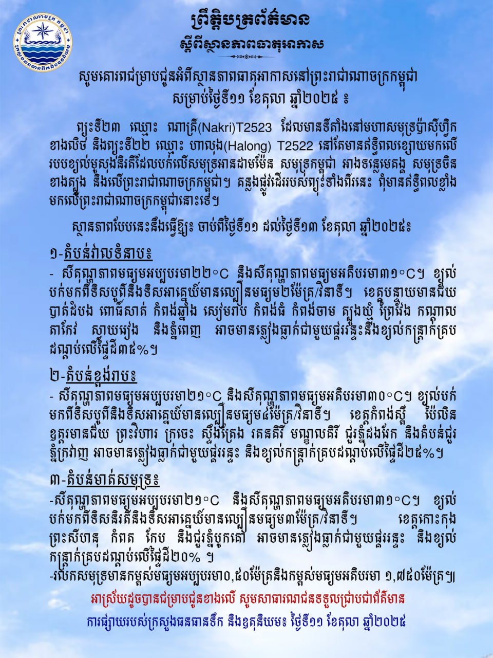 ក្រសួងធនធានទឹក ជូនដំណឹងអំពីស្ថានភាពធាតុអាកាសនៅកម្ពុជា សម្រាប់ថ្ងៃទី១១ ខែតុលា ឆ្នាំ២០២៥