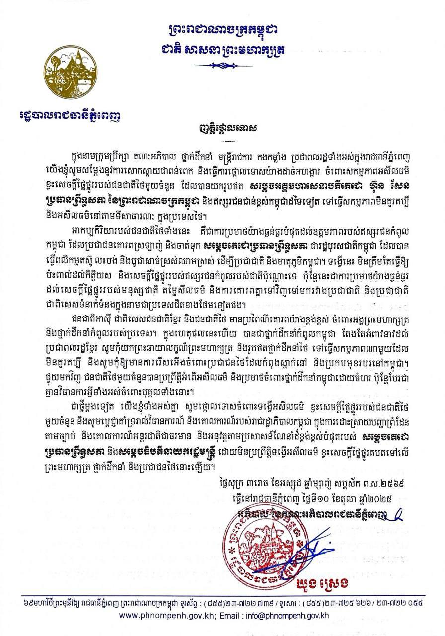 រដ្ឋបាលរាជធានីភ្នំពេញ ប្រកាសថ្កោលទោសយ៉ាងខ្លាំងក្លាបំផុត ចំពោះទង្វើវាយប្រហារ និងគ្មានការគោរពរបស់ក្រុមជ្រុលនិយមថៃ ដែលប្រព្រឹត្តមកលើសម្តេចតេជោ ហ៊ុន សែន និងឥស្សរជនកម្ពុជាផ្សេងទៀត