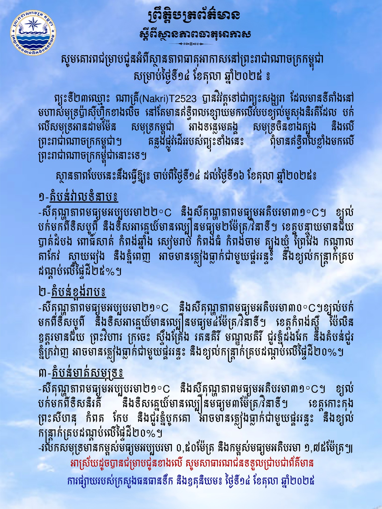 ក្រសួងធនធានទឹក ជូនដំណឹងអំពីស្ថានភាពធាតុអាកាសនៅកម្ពុជា សម្រាប់ថ្ងៃទី១៤ ខែតុលា ឆ្នាំ២០២៥