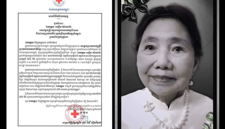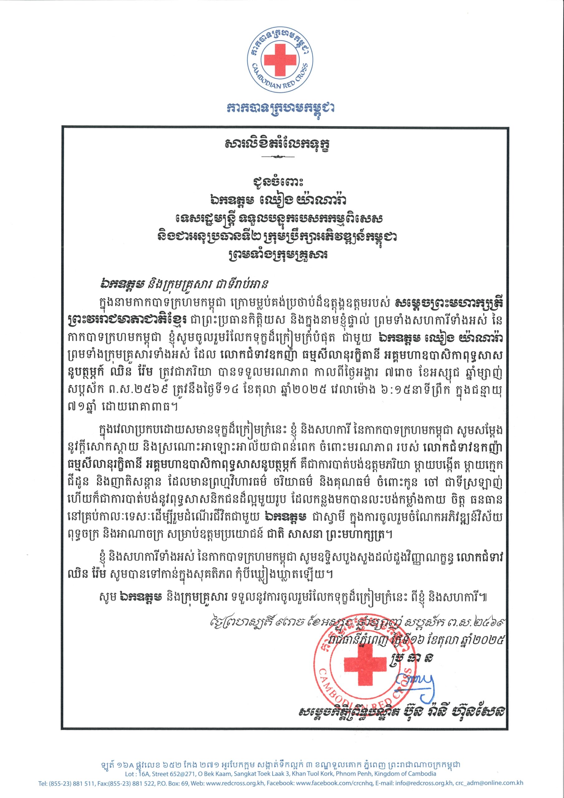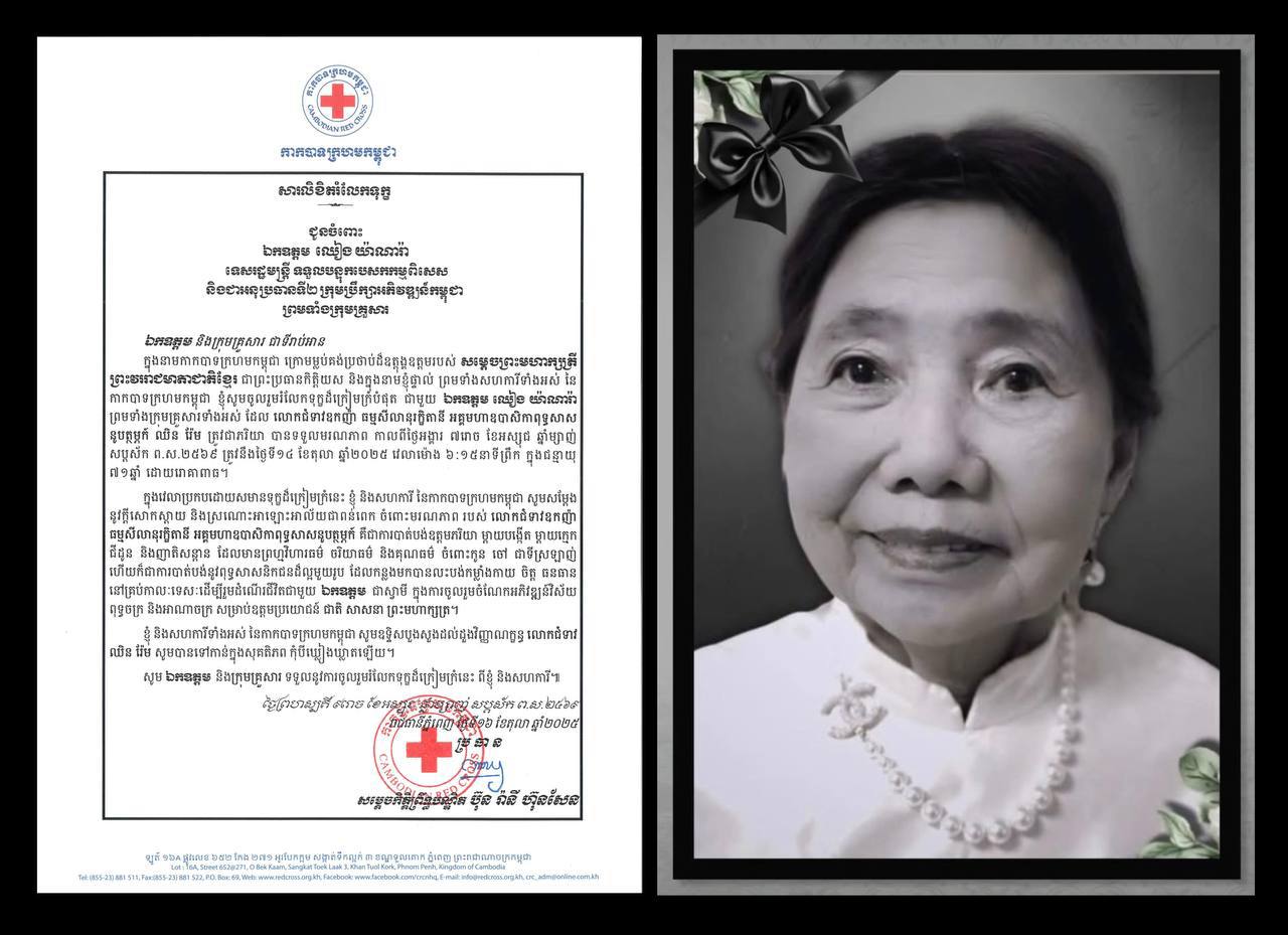 (ភ្នំពេញ)៖ សម្តេចកិត្តិព្រឹទ្ធបណ្ឌិត ប៊ុន រ៉ានី ហ៊ុនសែន ប្រធានកាកបាទក្រហមកម្ពុជា ផ្ញើសារលិខិតរំលែកទុក្ខជូនចំពោះ ឯកឧត្តម ឈៀង យ៉ាណារ៉ា ទេសរដ្ឋមន្ត្រី ទទួលបន្ទុកបេសកកម្មពិសេស និងជាអនុប្រធានទី២ ក្រុមប្រឹក្សាអភិវឌ្ឍន៍កម្ពុជា ព្រមទាំងក្រុមគ្រួសារ ចំពោះមរណភាពលោកជំទាវឧកញ៉ា ធម្មសីលានុរក្ខិតានី អគ្គមហាឧបាសិកាពុទ្ធសាសនូបត្ថម្ភក៍ ឈិន វ៉ែម ត្រូវជាភរិយា កាលពីថ្ងៃអង្គារ ៧រោច ខែអស្សុជ ឆ្នាំម្សាញ់ សប្តស័ក ព.ស.២៥៦៩ ត្រូវនឹងថ្ងៃទី១៤ ខែតុលា ឆ្នាំ២០២៥ វេលាម៉ោង ៦:១៥នាទីព្រឹក ក្នុងជន្មាយុ ៧១ឆ្នាំ ដោយរោគាពាធ។