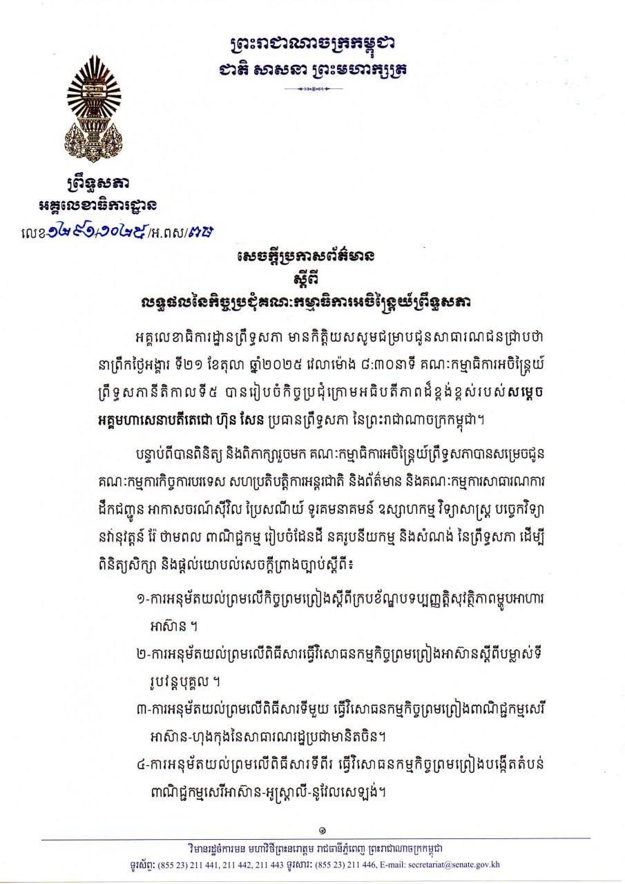 ព័ត៌មានជាតិសម្តេចតេជោ សេចក្តីប្រកាសព័ត៌មានស្តីពី លទ្ធផលនៃកិច្ចប្រជុំគណៈកម្មាធិការអចិន្ត្រៃយ៍ព្រឹទ្ធសភា នាព្រឹកថ្ងៃទី២១ ខែតុលា ឆ្នាំ២០២៥ ចេញផ្សាយ ថ្ងៃទី 21 ខែ តុលា ឆ្នាំ 2025 57 57