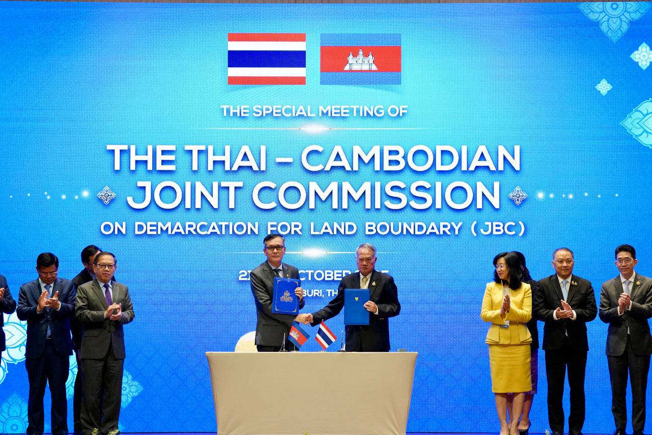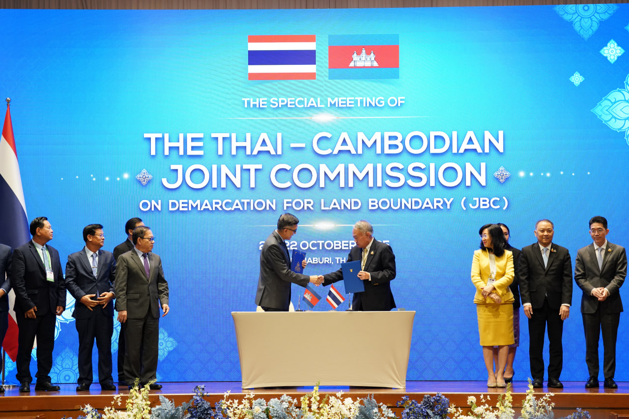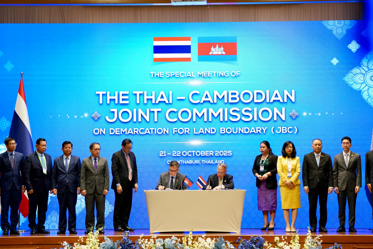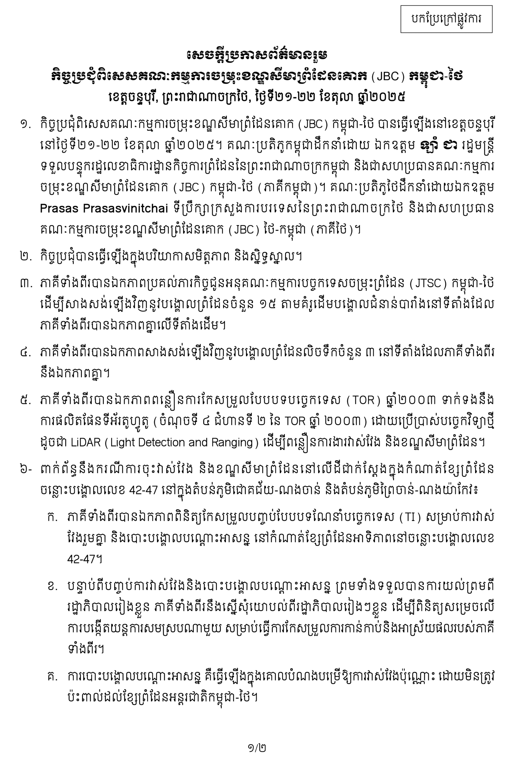 ១. កិច្ចប្រជុំពិសេសគណៈកម្មការចម្រុះខណ្ឌសីមាព្រំដែនគោក (JBC) កម្ពុជា-ថៃ បានធ្វើឡើងនៅខេត្តចន្ទបុរី នៅថ្ងៃទី២១-២២ ខែតុលា ឆ្នាំ២០២៥។ គណៈប្រតិភូកម្ពុជាដឹកនាំដោយ ឯកឧត្តម ឡាំ ជា រដ្ឋមន្តី ទទួលបន្ទុករដ្ឋលេខាធិការដ្ឋានកិច្ចការព្រំដែននៃព្រះរាជាណាចក្រកម្ពុជា និងជាសហប្រធានគណៈកម្មការចម្រុះខណ្ឌសីមាព្រំដែនគោក (JBC) កម្ពុជា-ថៃ (ភាគីកម្ពុជា)។ គណៈប្រតិភូថៃដឹកនាំដោយឯកឧត្តម
