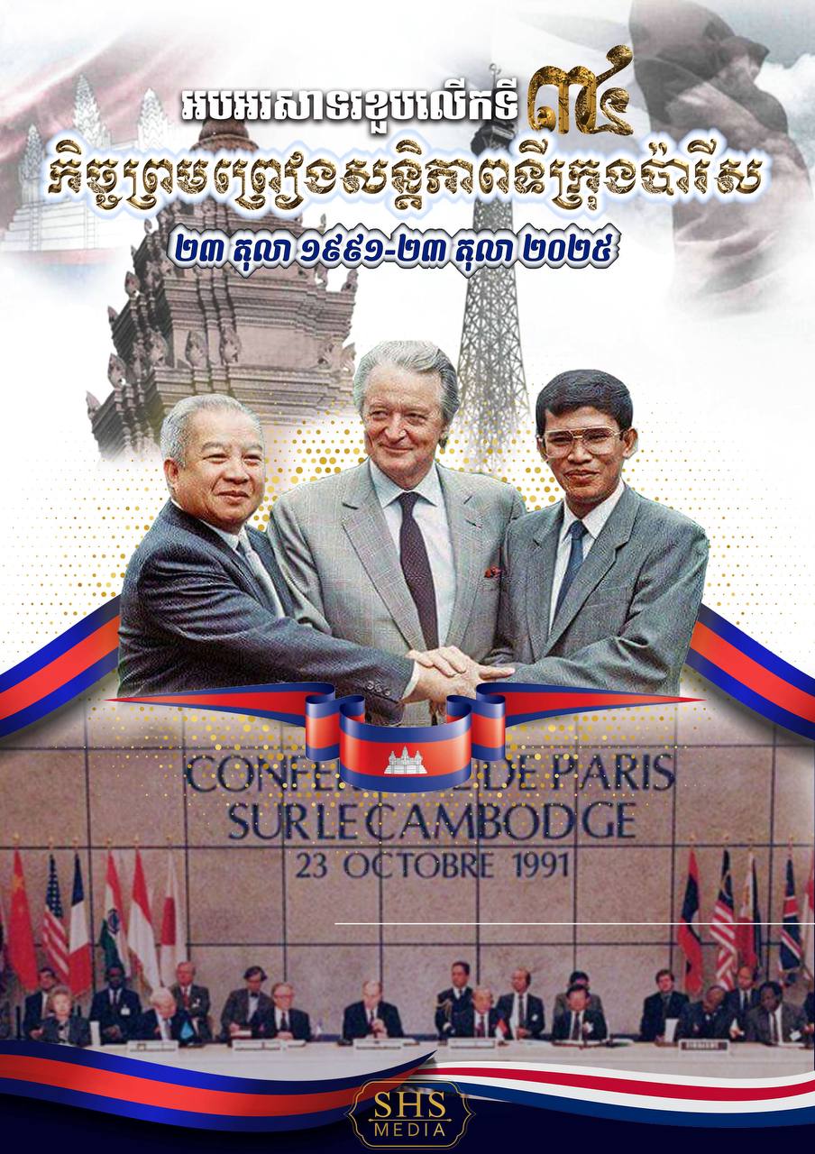 ៣៤ឆ្នាំមុន ពោលគឺនៅថ្ងៃទី ២៣ ខែតុលា ឆ្នាំ ១៩៩១ ភាគីទាំង ៤ របស់កម្ពុជារួមមាន៖ សម្តេចតេជោ ហ៊ុន សែន តំណាងឱ្យរដ្ឋាភិបាលកម្ពុជា ចលនាតស៊ូហ៊្វុនស៊ិនប៉ិច ដែលតំណាងដោយសម្តេចព្រះ នរោត្តម សីហនុ និងសម្តេចក្រុមព្រះ នរោត្តម រណឫទ្ធិ រណសិរ្សជាតិរំដោះប្រជាពលរដ្ឋខ្មែរ ដែលតំណាងដោយ លោក សឺន សាន និង ក្រុមចលនាកម្ពុជាប្រជាធិបតេយ្យ តំណាងដោយ លោក ខៀវ សំផន បានឈានទៅចុះហត្ថលេខា លើកិច្ចព្រមព្រៀងសន្តិភាព នៅទីក្រុងប៉ារីស ប្រទេសបារាំង ក្រោមវត្តមានសាក្សីមកពី ១៨ប្រទេស រួមទាំងអគ្គលេខាធិការអង្គការសហប្រជាជាតិ (UN) ផងដែរ ដើម្បីបញ្ចប់សង្គ្រាមស៊ីវិលនៅកម្ពុជា។