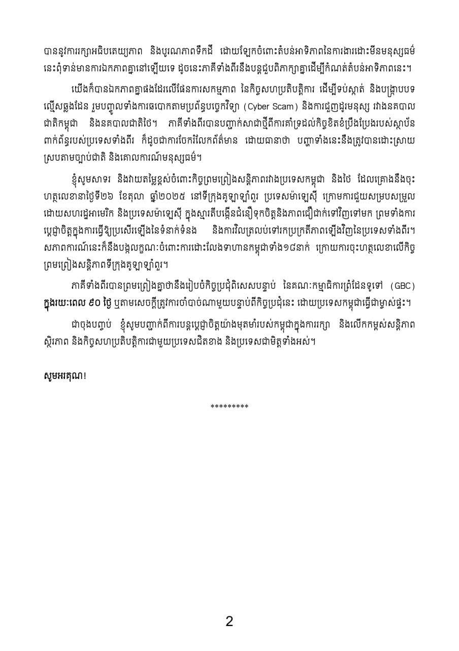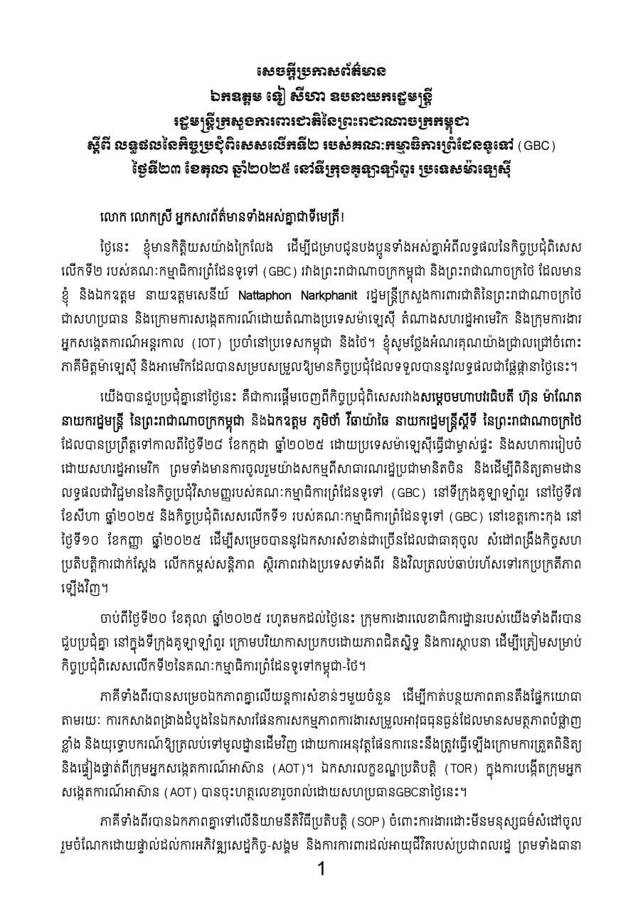 ក្នុងនោះ នៅក្នុងឱកាសបង្ហាញលទ្ធផលកិច្ចប្រជុំពិសេសលើកទី ២ នៃគណៈកម្មាធិការព្រំដែនទូទៅកម្ពុជា-ថៃ នៅលើទឹកដីប្រទេសម៉ាឡេស៊ី ថ្ងៃទី ២៣ ខែតុលា ឆ្នាំ ២០២៥ នេះ ឧបនាយករដ្ឋមន្ត្រី ទៀ សីហា បានថ្លែងយ៉ាងដូច្នេះថា ៖ «ខ្ញុំសូមសាទរ និង វាយតម្លៃខ្ពស់ចំពោះកិច្ចខិតខំប្រឹងប្រែង និង កិច្ចព្រមព្រៀងសន្តិភាពរវាងប្រទេសកម្ពុជា និង ថៃ ដែលគ្រោងនឹងចុះហត្ថលេខា នៅថ្ងៃទី ២៦ ខែតុលា ឆ្នាំ ២០២៥ នៅទីក្រុងកូឡាឡាំពួរ ប្រទេសម៉ាឡេស៊ី ក្រោមការជួយសម្របសម្រួលដោយសហរដ្ឋអាមេរិក និង ប្រទេសម៉ាឡេស៊ី»។