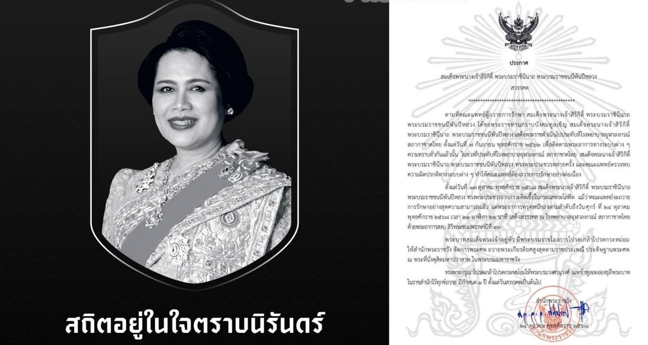 (បាងកក)៖ យោងតាមការប្រកាសរបស់ព្រះបរមរាជវាំងថៃបានឲ្យដឹងថា ព្រះមាតារបស់ព្រះមហាក្សត្រថៃ ព្រះនាម សិរីគិត ព្រះមហាក្សត្រី បានយាងសោយទិវង្គតក្នុងព្រះជន្មាយុ៩៣ព្រះវស្សា នេះបើយោងតាមសាររព័ត៌មាន The Nation ចេញផ្សាយនៅព្រឹកថ្ងៃទី២៥ ខែតុលា ឆ្នាំ២០២៥នេះ។