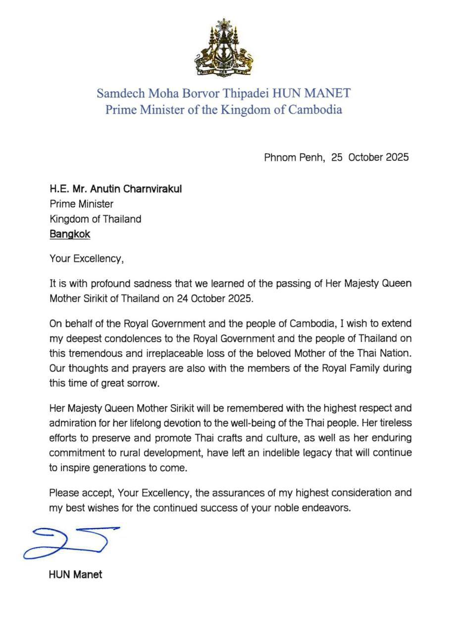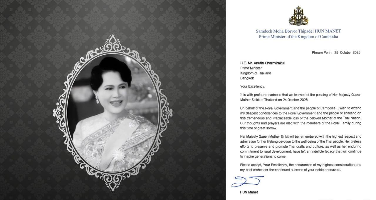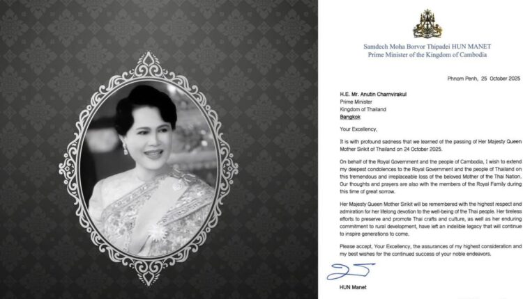 សម្តេចមហាបវរធិបតី ហ៊ុន ម៉ាណែត ផ្ញើសារលិខិតរំលែកមរណទុក្ខ ចំពោះការយាងសោយទិវង្គតរបស់ព្រះមហាក្សត្រី សិរីគិត ព្រះមាតាជាតិថៃ