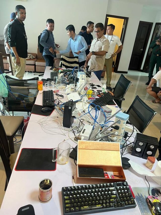 កម្លាំងនៃអគ្គស្នងការដ្ឋាននគរបាលជាតិ សហការជាមួយកម្លាំងចម្រុះនៃគណ:បញ្ជាការឯកភាពខណ្ឌចំការមន និងកម្លាំងជំនាញនៃស្នងការដ្ឋាននគរបាលរាជធានីភ្នំពេញ ដោយមានការសម្របសម្រួលផ្លូវច្បាប់ពីព្រះរាជអាជ្ញារង នៃអយ្យការអមសាលាដំបូងរាជធានីភ្នំពេញ នៅថ្ងៃទី២៨ ខែតុលា ឆ្នាំ២០២៥ បានចុះពិនិត្យ និងបង្រ្កាបករណីឆបោកតាមប្រព័ន្ធបច្ចេកវិទ្យា នៅទីតាំងបន្ទប់ B17-05 ស្ថិតនៅអគារខុនដូរវិមានកុលាប អគារB ជាន់ទី១៧ ផ្លូវនរោត្តម សង្កាត់ទន្លេបាសាក់ ខណ្ឌចំការមន រាជធានីភ្នំពេញ ដោយឃាត់ខ្លួនបុរសជនជាតិចិនដែលជាជនសង្ស័យចំនួន៧នាក់។