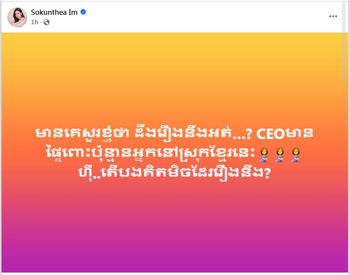 នេះជាសារទាំងស្រុករបស់អ្នកនាង អ៊ឹម សុគន្ធា បានសរសេររៀបរាប់លើគណនីហ្វេសប៊ុកខ្លួន ៖ «មានគេសួរខ្ញុំថា ដឹងរឿងហ្នឹងអត់…? CEO មានផ្ទៃពោះប៉ុន្មានអ្នកនៅស្រុកខ្មែរនេះ ហ៊ឺ តើបងគិតម៉េចដែររឿងហ្នឹង? រាល់ថ្ងៃនេះ រឿងក្នុងសង្គមបច្ចុប្បន្នមានច្រើនស្ទើររាល់ថ្ងៃ តែសួរថាតាមទាន់អត់ចែ?… ចង់ប្រាប់ថាតាមមិនទាន់ទេ ពីព្រោះរវល់ពេកធ្វើការផង ដើរលេងផង អ៊ីចឹងបានមិនសូវដឹងរឿងអីច្រើនទេ ហើយតែងតែមានគេឆាតសួរ ហើយប្រាប់បានដឹងរឿងខ្លះ តាមមិនទាន់ស្ទើរគ្រប់រឿង។ ហើយរឿងយប់មិញហ្នឹងមានគេឆាតសួរខ្ញុំដែរ ហើយខមិនខ្លះក៏ឃើញមានឈ្មោះខ្ញុំដែរ… ខ្ញុំក៏ជា CEO ម្នាក់ដែលកំពុងមានទម្ងន់ តែសួរថាប៉ះពាល់ផ្លូវអារម្មណ៍ខ្ញុំអត់? ចង់ប្រាប់ថា… អត់ទេបងប្អូនកុំបារម្ភ មើលតែរូបថតមួយសន្លឹកហ្នឹងទៅដឹងហើយចាសហ្វេនៗ។ ការស្រឡាញ់ប្ដីប្រពន្ធ ការជឿជាក់គ្នា ការអត់ឱនគ្នា គឺមិនអាចមានជនទី ៣ មកបំផ្លាញយើងបានទេ សូមកុំគិតច្រើនម៉ាក់ CEO ទាំងអស់ ខ្ញុំគិតថារឿងនេះមានមែនជារឿងពិតទេ អ្នកដែលសរសេរហ្នឹងមើលទៅដូចកើតរោគចិត្តទេ»៕