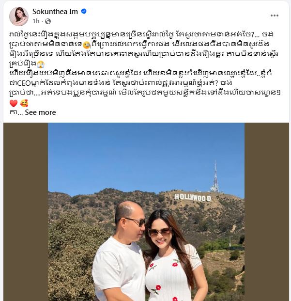 យ៉ាងណាមិញ ចំពោះអ្នកនាង អ៊ឹម សុគន្ធា បើតាមការបង្ហោះលើហ្វេសប៊ុក អ្នកនាងបានឱ្យដឹងថាខ្លួនមិនបានឈឺក្បាលហាលថ្ងៃនឹងរឿងរ៉ាវនេះឡើយ ហើយថែមទាំងបានបង្ហាញឱ្យដឹងពីជីវិតប្ដីប្រពន្ធរបស់អ្នកនាង ដែលមានតែក្ដីស្រឡាញ់ ភាពជឿជាក់ និង ការអត់ឱនគ្នា គឺមិនអាចមានអ្នកទី ៣ មកបំផ្លាញជីវិតគ្រួសាររបស់អ្នកនាងឡើយ។