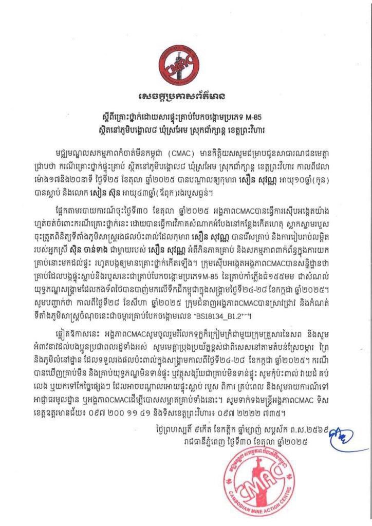 ភ្នំពេញ ៖ ក្រោយកើតមានករណីគ្រោះថ្នាក់ផ្ទុះគ្រាប់ ស្ថិតនៅភូមិបង្គោល៨ ឃុំស្រអែម ស្រុកជាំក្សាន្ត ខេត្តព្រះវិហារ កាលពីវេលាម៉ោង១៧និង២០នាទី ថ្ងៃទី២៥ ខែតុលា ឆ្នាំ២០២៥ បានបណ្តាលឲ្យកុមារា សឿន សុវណ្ណ អាយុ១០ឆ្នាំ(កូន)បានស្លាប់ និងលោក សៀន ស៊ុន អាយុ៤៣ឆ្នាំ(ឪពុក)រងរបួសធ្ងន់។
