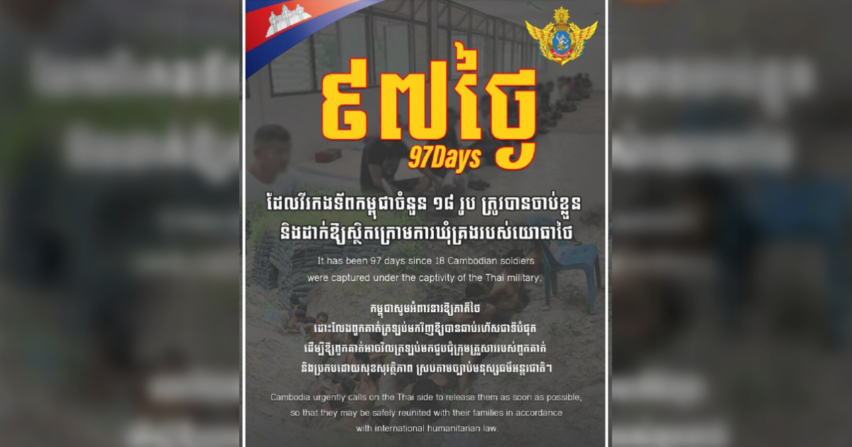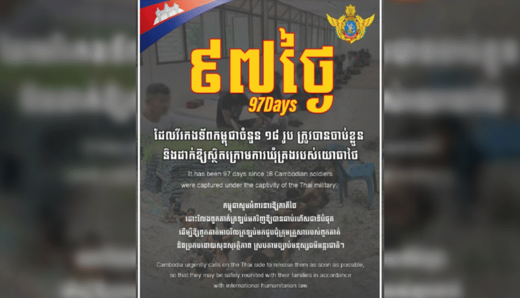 ថ្ងៃនេះជា ថ្ងៃទី៩៧ហើយ ដែលវីរកងទ័ពកម្ពុជាចំនួន ១៨រូប ត្រូវបានចាប់ខ្លួន និងដាក់ឱ្យស្ថិតក្រោមការឃុំគ្រងរបស់យោធាថៃ។