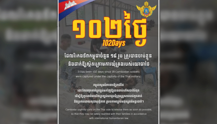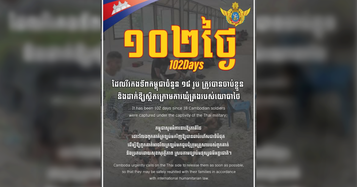 ថ្ងៃនេះជា ថ្ងៃទី១០២ហើយ ដែលវីរកងទ័ពកម្ពុជាចំនួន ១៨រូប ត្រូវបានចាប់ខ្លួន និងដាក់ឱ្យស្ថិតក្រោមការឃុំគ្រងរបស់យោធាថៃ