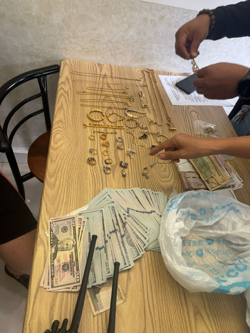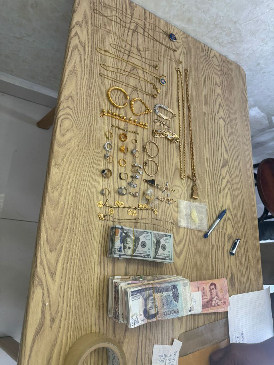 លោក ម៉ន វុធី បានបន្តទៀតថា នៅក្នុងសកម្មភាព ជនសង្ស័យបានគាស់យកលុយ និងគ្រឿងអលង្ការួមមាន ប្រាក់ដុល្លាប្រហែល ៤៥ ០០០ដុល្លារ , ចិញ្ចៀនពេជ្រ០៣វង់ គិតជាប្រាក់ចំនួន ១១ ៥០០ដុល្លារ, ខ្សែដៃពេជ្រ ០២ខ្សែ ១១ ០០០ដុល្លារ , ខ្សែដៃមាស ០២ខ្សែ (ទម្ងន់០១តម្លឹង) គិតជាប្រាក់ចំនួន ៥៥០០ដុល្លារ , ខ្សែកមាស ៤ខ្សែ (ទម្ងន់០១ តម្លឹងគន្លះ) គិតជាប្រាក់ចំនួន ៨២៥០ដុល្លារ , ខ្សែកផ្លាកទីន០២ ខ្សែ (ទម្ងន់០៤តម្លឹង) គិតជាប្រាក់ចំនួន ១៦០០០ដុល្លារ , ចិញ្ចៀនមាស០១វង់ (ទម្ងន់០៥ជី) គិតជាប្រាក់ចំនួន ២៣០០ដុល្លារ , ចិញ្ចៀនផ្លាកទីន ០៣វង់ (ទម្ងន់០៨ជី) គិតជាប្រាក់ចំនួន ២៥០០ដុល្លារ ,ចិញ្ចៀន ត្បូងទន្ទឹម ០១វង់ គិតជាប្រាក់ចំនួន ៦០០ដុល្លារ, កងដៃមាស១កង (ទម្ងន់០៨៨) គិតជាប្រាក់ចំនួន ២៣០០ដុល្លារ, ក្រវិពេជ្រ ១គូគិតជាប្រាក់ចំនួន ៥៥០០ដុល្លារនិងកងដៃផ្លាកទីន ០២កងគិតជាប្រាក់ចំនួន ២០០០ដុល្លារ សរុបជាទឹកប្រាក់ចំនួន១១២ ៤៥០ដុល្លារ ។