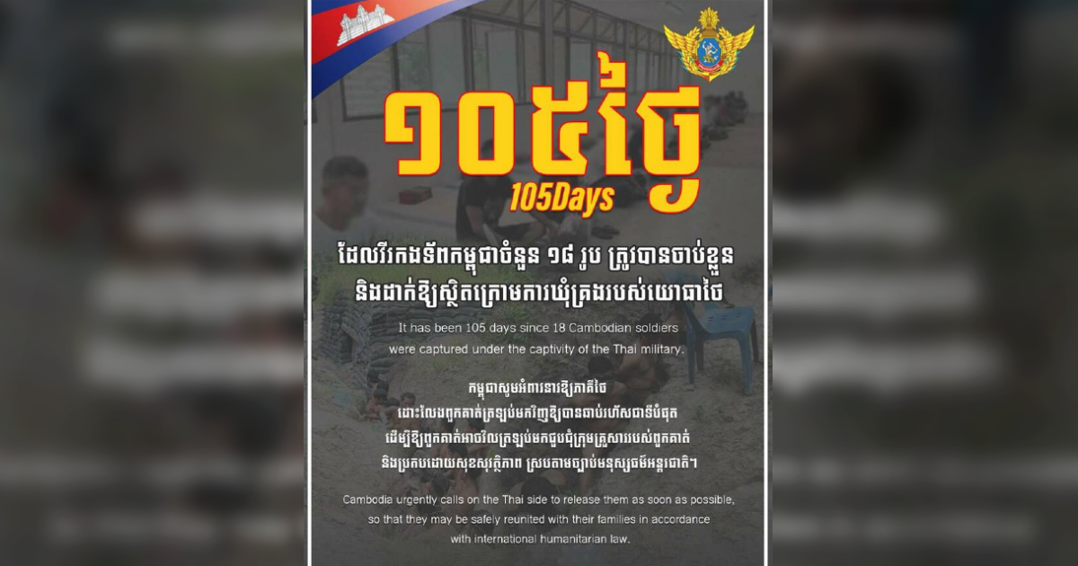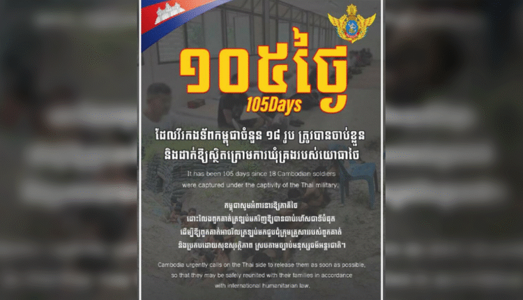 ថ្ងៃនេះជា ថ្ងៃទី១០៥ហើយ ដែលវីរកងទ័ពកម្ពុជាចំនួន ១៨រូប ត្រូវបានចាប់ខ្លួន និងដាក់ឱ្យស្ថិតក្រោមការឃុំគ្រងរបស់យោធាថៃ។