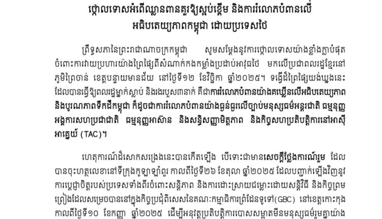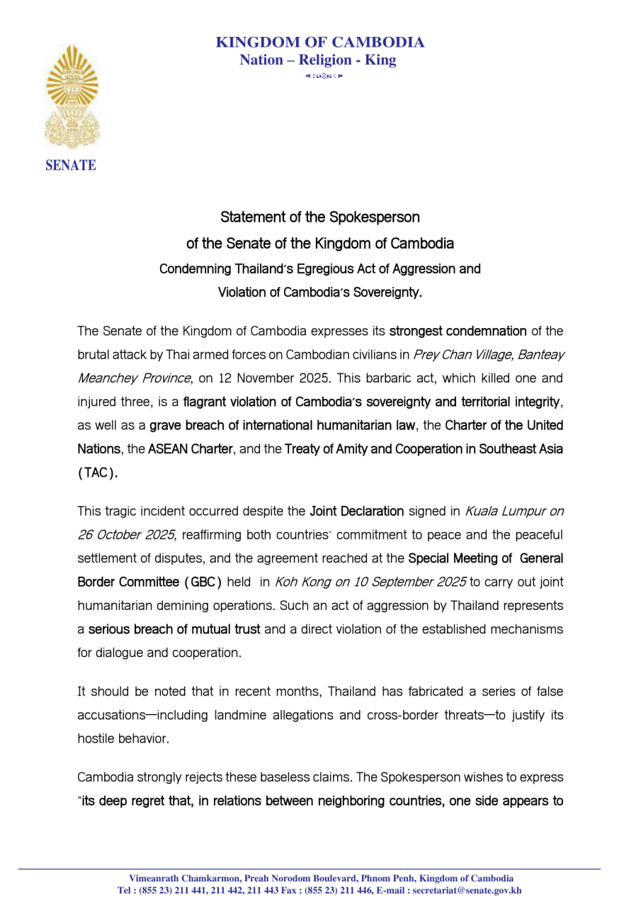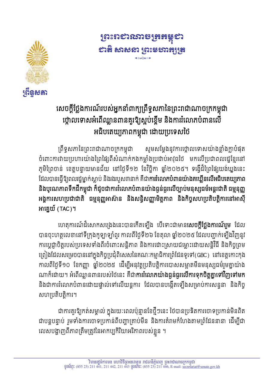 ព្រឹទ្ធសភានៃព្រះរាជាណាចក្រកម្ពុជា សូមសម្តែងនូវការថ្កោលទោសយ៉ាងខ្លាំងក្លាបំផុត ចំពោះការវាយប្រហារយ៉ាងព្រៃផ្សៃពីសំណាក់កងកម្លាំងប្រដាប់អាវុធថៃ មកលើប្រជាពលរដ្ឋខ្មែរនៅ ភូមិព្រៃចាន់ ខេត្តបន្ទាយមានជ័យ នៅថ្ងៃទី១២ ខែវិច្ឆិកា ឆ្នាំ២០២៥។ ទង្វើដ៏ព្រៃផ្សៃយង់ឃ្នងនេះ ដែលបានធ្វើឱ្យពលរដ្ឋម្នាក់ស្លាប់ និងរងរបួស៣នាក់ គឺជាការរំលោភបំពានយ៉ាងគឃ្លីនលើអធិបតេយ្យភាព និងបូរណភាពទឹកដីកម្ពុជា ក៏ដូចជាការរំលោភបំពានយ៉ាងធ្ងន់ធ្ងរលើច្បាប់មនុស្សធម៌អន្តរជាតិ ធម្មនុញ្ញ អង្គការសហប្រជាជាតិ ធម្មនុញ្ញអាស៊ាន និងសន្ធិសញ្ញាមិត្តភាព និងកិច្ចសហប្រតិបត្តិការនៅអាស៊ី អាគ្នេយ៍ (TAC)។