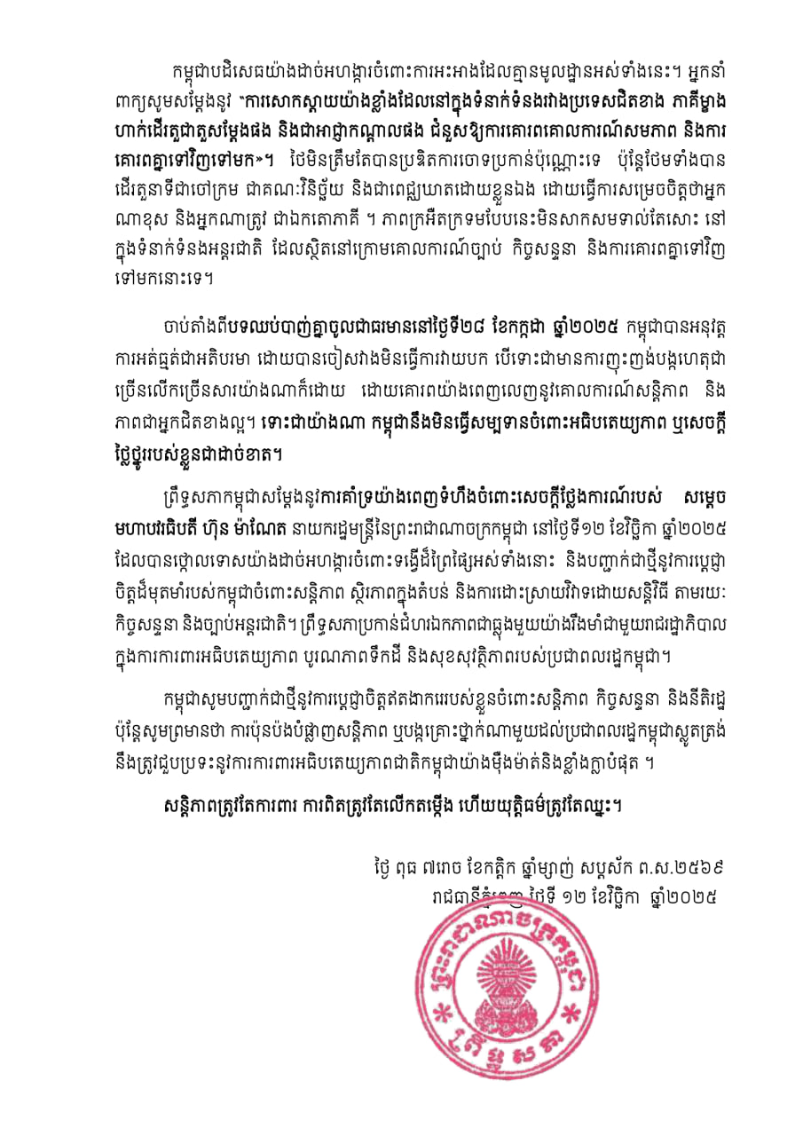 ចាប់តាំងពីបទឈប់បាញ់គ្នាចូលជាធរមាននៅថ្ងៃទី២៨ ខែកក្កដា ឆ្នាំ២០២៥ កម្ពុជាបានអនុវត្ត ការអត់ធ្មត់ជាអតិបរមា ដោយបានចៀសវាងមិនធ្វើការវាយបក បើទោះជាមានការញុះញង់បង្កហេតុជា ច្រើនលើកច្រើនសារយ៉ាងណាក៏ដោយ ដោយគោរពយ៉ាងពេញលេញនូវគោលការណ៍សន្តិភាព និង ភាពជាអ្នកជិតខាងល្អ។ ទោះជាយ៉ាងណា កម្ពុជានឹងមិនធ្វើសម្បទានចំពោះអធិបតេយ្យភាព ឬសេចក្តី ថ្លៃថ្នូររបស់ខ្លួនជាដាច់ខាត។