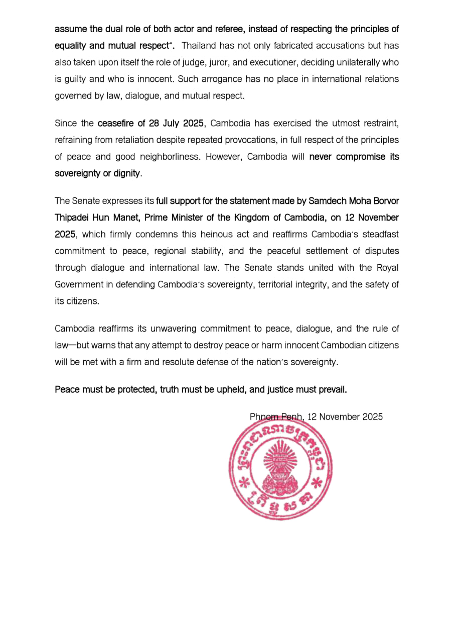 ព្រឹទ្ធសភាកម្ពុជាសម្តែងនូវការគាំទ្រយ៉ាងពេញទំហឹងចំពោះសេចក្តីថ្លែងការណ៍របស់ សម្តេច មហាបវរធិបតី ហ៊ុន ម៉ាណែត នាយករដ្ឋមន្ត្រីនៃព្រះរាជាណាចក្រកម្ពុជា នៅថ្ងៃទី១២ ខែវិច្ឆិកា ឆ្នាំ២០២៥ ដែលបានថ្កោលទោសយ៉ាងដាច់អហង្ការចំពោះទង្វើដ៏ព្រៃផ្សៃអស់ទាំងនោះ និងបញ្ជាក់ជាថ្មីនូវការប្តេជ្ញា ចិត្តដ៏មុតមាំរបស់កម្ពុជាចំពោះសន្តិភាព ស្ថិរភាពក្នុងតំបន់ និងការដោះស្រាយវិវាទដោយសន្តិវិធី តាមរយៈ កិច្ចសន្ទនា និងច្បាប់អន្តរជាតិ។ ព្រឹទ្ធសភាប្រកាន់ជំហរឯកភាពជាធ្លុងមួយយ៉ាងរឹងមាំជាមួយរាជរដ្ឋាភិបាល ក្នុងការការពារអធិបតេយ្យភាព បូរណភាពទឹកដី និងសុខសុវត្ថិភាពរបស់ប្រជាពលរដ្ឋកម្ពុជា។