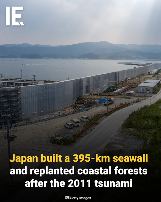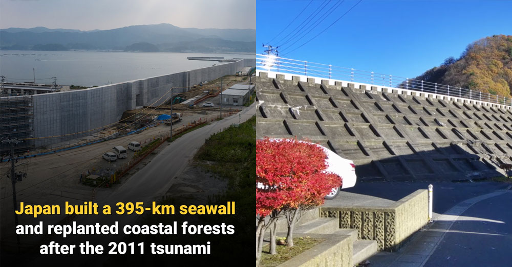 (បរទេស)៖ បន្ទាប់ពីរលកយក្សស៊ូណាមិឆ្នាំ២០១១ ប្រទេសជប៉ុនបានសាងសង់ជញ្ជាំងបេតុងសមុទ្រប្រវែង ៣៩៥ គីឡូម៉ែត្រឆ្លងកាត់ឆ្នេរសមុទ្រភាគឦសានរបស់ខ្លួន ដែលជាតំបន់ការពារឆ្នេរសមុទ្រដ៏ធំបំផុតមួយរបស់ពិភពលោក។ ជាមួយគ្នានេះ ដើមរាប់លានដើមត្រូវបានដាំ ដើម្បីស្តារព្រៃឈើដែលបានបាត់បង់ និងបង្កើតជារបាំងធម្មជាតិ ការពារនឹងរលកនាពេលអនាគត។