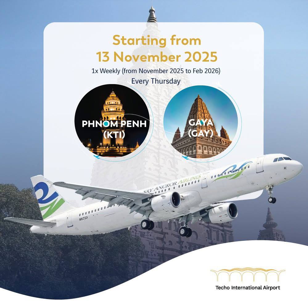 ជើងហោះហើរត្រង់ពីអាកាសយានដ្ឋានអន្ដរជាតិតេជោ ភ្នំពេញ ទៅកាន់ពុទ្ធគយា ប្រទេសឥណ្ឌា ចាប់ផ្ដើមពីខែវិច្ឆិកាតទៅ