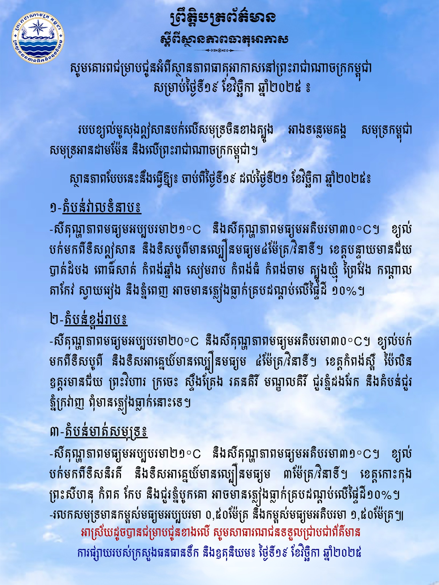 ក្រសួងធនធានទឹក ជូនដំណឹងអំពីស្ថានភាពធាតុអាកាសនៅកម្ពុជា សម្រាប់ថ្ងៃទី១៩ ខែវិច្ឆិកា ឆ្នាំ២០២៥