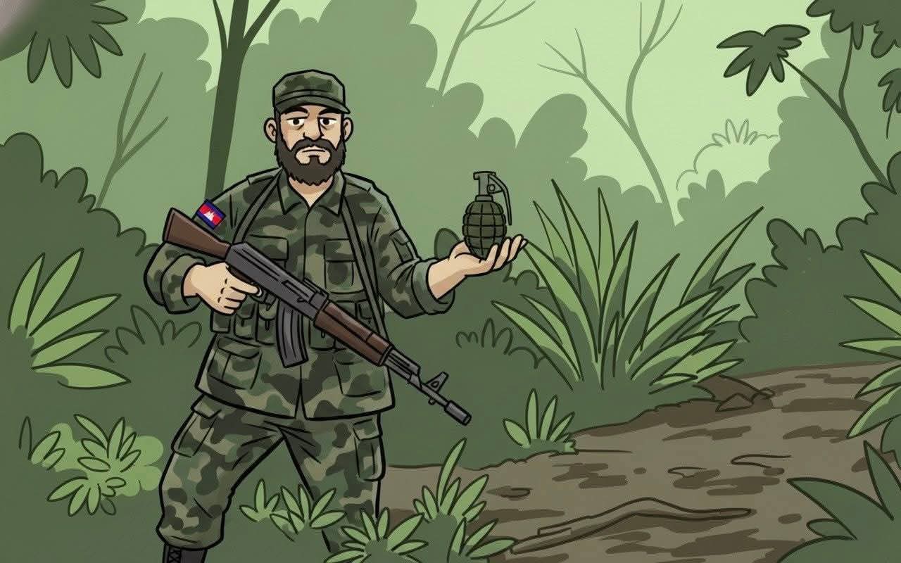 ទិដ្ឋភាពដ៏អង់អាចរបស់វីរកងទ័ពខ្មែរ ក្លាហានត្រៀមចិត្តពលីមិនញញើតសត្រូវ ដៃម្ខាងកាន់គ្រា-/ប់បែ-ក ម្ខាងទៀតកាន់កាំ-ភ្លើ-ង ឈរពាំងការឈ្លានពានពីភាគីថៃ