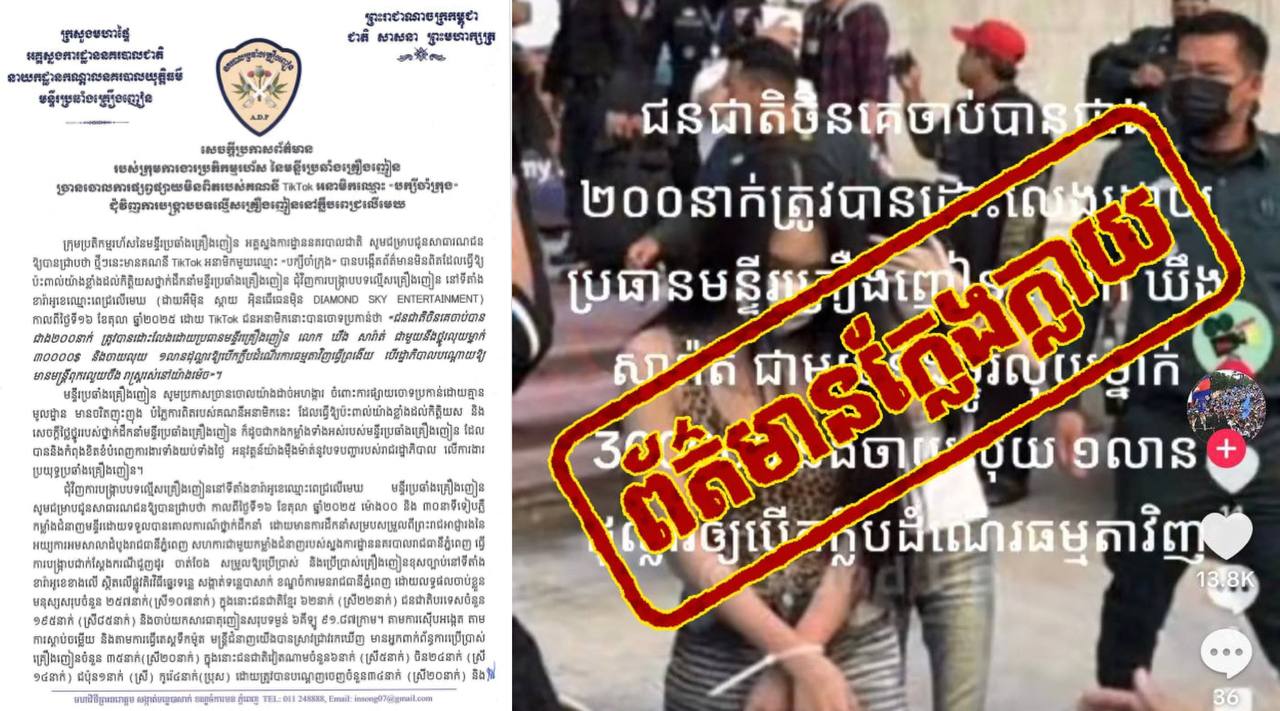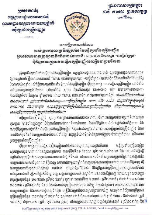 មន្ទីរប្រឆាំងគ្រឿងញៀន ច្រានចោលទាំងស្រុង ចំពោះការបង្កើតព័ត៌មានក្លែងក្លាយ របស់គណនី TikTok អនាមិកឈ្មោះ «បក្សីចាំក្រុង» ជុំវិញការបង្ក្រាបបទល្មើសគ្រឿងញៀន នៅក្លឹបពេជ្រលើមេឃ