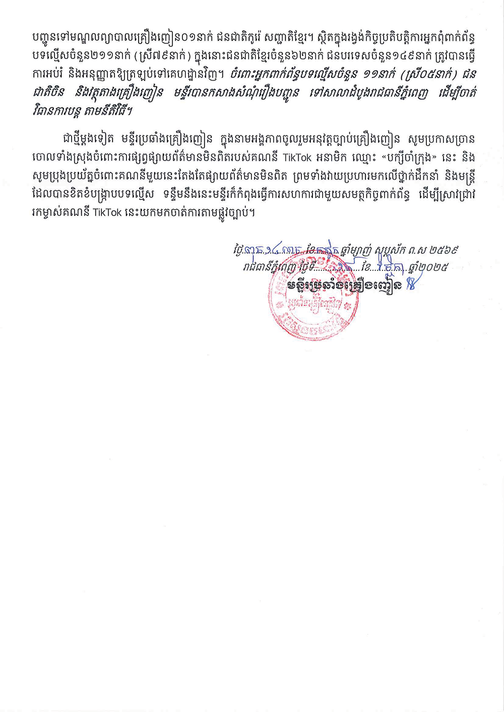 (ភ្នំពេញ)៖ មន្ទីរប្រឆាំងគ្រឿងញៀន នៅថ្ងៃទី១៩ ខែវិច្ឆិកា ឆ្នាំ២០២៥នេះ បានចេញសេចក្តីប្រកាសព័ត៌មាន ប្រកាសច្រានចោលយ៉ាងដាច់អហង្ការ ចំពោះការផ្សាយចោទប្រកាន់ដោយគ្មាន មូលដ្ឋាន មានចរិតញុះញុង បំភ្លៃការពិតរបស់គណនីអនាមិក ឈ្មោះ «បក្សីចាំក្រុង» ដែលធ្វើឱ្យប៉ះពាល់យ៉ាងខ្លាំងដល់កិត្តិយស និងសេចក្តីថ្លៃថ្នូររបស់ថ្នាក់ដឹកនាំមន្ទីរប្រឆាំងគ្រឿងញៀន ក៏ដូចជាកងកម្លាំងទាំងអស់របស់មន្ទីរប្រឆាំងគ្រឿងញៀន ដែលបាននិងកំពុងខិតខំបំពេញការងារទាំងយប់ទាំងថ្ងៃ អនុវត្តន៍យ៉ាងម៉ឺងម៉ាត់នូវបទបញ្ជារបស់រាជរដ្ឋាភិបាល លើការងារ ប្រយុទ្ធប្រឆាំងគ្រឿងញៀន។