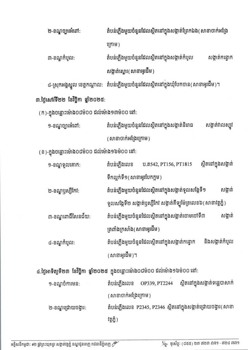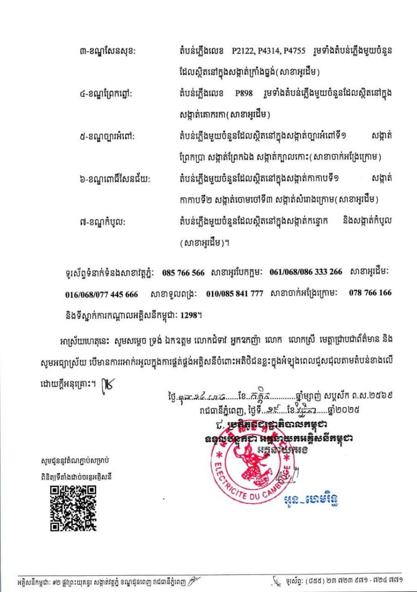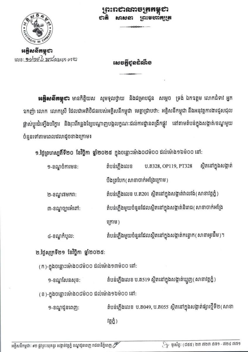 អគ្គិសនីកម្ពុជា នៅថ្ងៃទី១៩ ខែវិច្ឆិកា ឆ្នាំ២០២៥ នេះ បានចេញ សេចក្តីជូនដំណឹង ទូលថ្វាយ និងជម្រាបជូន សម្តេច ទ្រង់ ឯកឧត្តម លោកជំទាវ អ្នក ឧកញ៉ា លោក លោកស្រី ដែលជាអតិថិជនរបស់អគ្គិសនីកម្ពុជា ជ្រាបថា អគ្គិសនីកម្ពុជា នឹងអនុវត្តការងារជួសជុល ផ្លាស់ប្តូរដំឡើងបរិក្ខា និងរុះរើគន្លងខ្សែបណ្តាញបង្កលក្ខណៈដល់ការដ្ឋានពង្រីកផ្លូវ នៅតាមតំបន់ក្នុងសង្កាត់/ខណ្ឌមួយចំនួន នៅរាជធានីភ្នំពេញ ចាប់ពីថ្ងៃទី២០ ដល់ ២២ វិច្ឆិកានេះ។