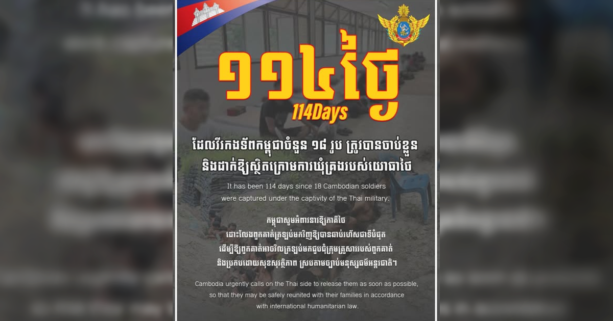 ថ្ងៃនេះជា ថ្ងៃទី១១៤ ហើយ ដែលវីរកងទ័ពកម្ពុជាចំនួន១៨រូប ត្រូវបានចាប់ខ្លួន និងដាក់ឱ្យស្ថិតក្រោមការឃុំគ្រងរបស់យោធាថៃ។