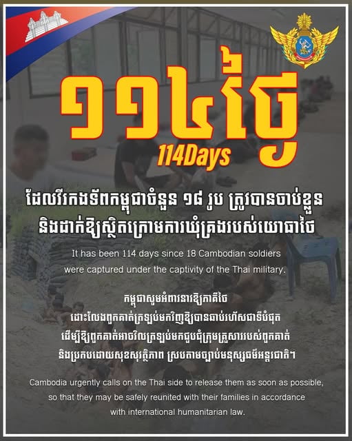 ថ្ងៃនេះជា ថ្ងៃទី១១៤ ហើយ ដែលវីរកងទ័ពកម្ពុជាចំនួន១៨រូប ត្រូវបានចាប់ខ្លួន និងដាក់ឱ្យស្ថិតក្រោមការឃុំគ្រងរបស់យោធាថៃ