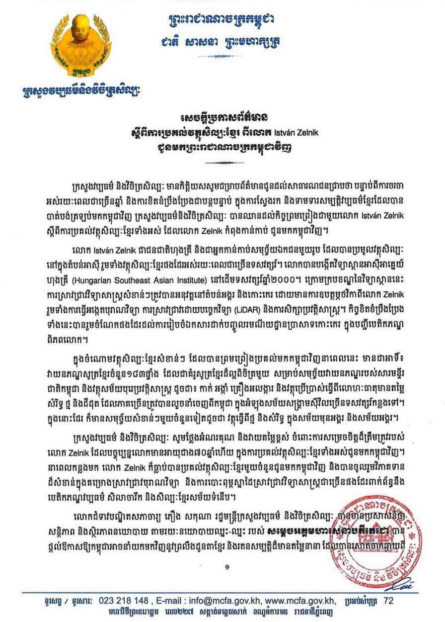 សម្តេចមហាបវរធិបតី ហ៊ុន ម៉ាណែត បានបញ្ជាក់ថា «សូមអបអរសាទរ និងស្វាគមន៍រតនវត្ថុសិល្បៈខ្មែរ មាតុភូមិនិវត្តវិញ! អនុវត្តតាមគោលការណ៍ដ៏ហ្មត់ចត់របស់រាជរដ្ឋាភិបាល ក្នុងនាមជាសេនាធិការផ្ទាល់ក្រសួងវប្បធម៌ និងវិចិត្រសិល្បៈ បានខិតខំប្រឹងប្រែងចរចាជាមួយលោក István Zelnik ជនជាតិហុងគ្រី និងរដ្ឋាភិបាលហុងគ្រី ដេីម្បីនាំយករតនវត្ថុសិល្ប:ខ្មែរត្រឡប់មកកាន់មាតុភូមិវិញ»។