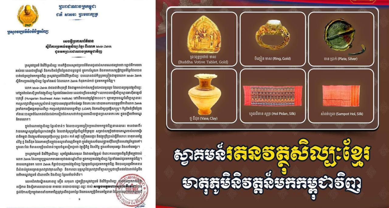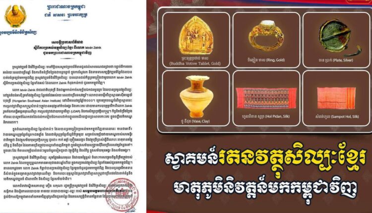 (ភ្នំពេញ)៖ សម្តេចមហាបវរធិបតី ហ៊ុន ម៉ាណែត នាយករដ្ឋមន្ត្រីកម្ពុជា នៅថ្ងៃទី២១ ខែវិច្ឆិកា ឆ្នាំ២០២៥ បានអបអរសាទរ និងស្វាគមន៍រតនវត្ថុសិល្បៈខ្មែរ ដែលត្រូវមាតុភូមិនិវត្តវិញ ក្រោយការចរចាជាមួយលោក István Zelnik ជនជាតិហុងគ្រី និងរដ្ឋាភិបាលហុងគ្រី ដេីម្បីនាំយករតនវត្ថុសិល្ប:ខ្មែរត្រឡប់មកកាន់មាតុភូមិវិញ។