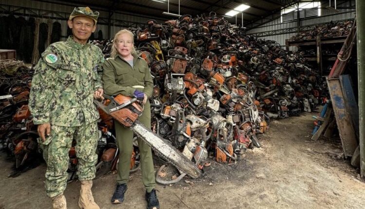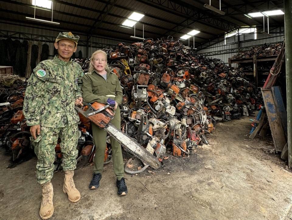 ស្ថាបនិក និងជានាយិកាប្រតិបត្តិ នៃអង្គការសម្ព័ន្ធមិត្តសត្វព្រៃ (Wildlife Alliance Cambodia) កញ្ញាស៊ូវណ្ណា ហ្គោនឡែត ឈរទន្ទឹមគ្នានឹងលោក គង់ ចិត្រា មន្ត្រីនគរបាលយុត្តិធម៌ និងជាប្រធានក្រុមការងារចុះល្បាតស្នាក់ការស្រែអំបិល នៅឃ្លាំងរក្សាទុករណាយន្តទាំងនេះ។