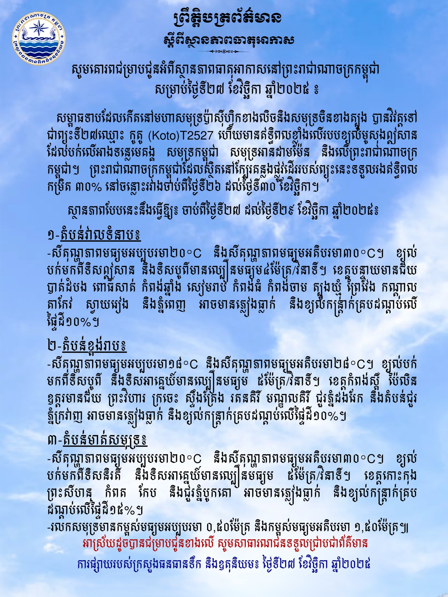 ក្រសួងធនធានទឹក ជូនដំណឹងអំពីស្ថានភាពធាតុអាកាសនៅកម្ពុជា សម្រាប់ថ្ងៃទី២៧ ខែវិច្ឆិកា ឆ្នាំ២០២៥