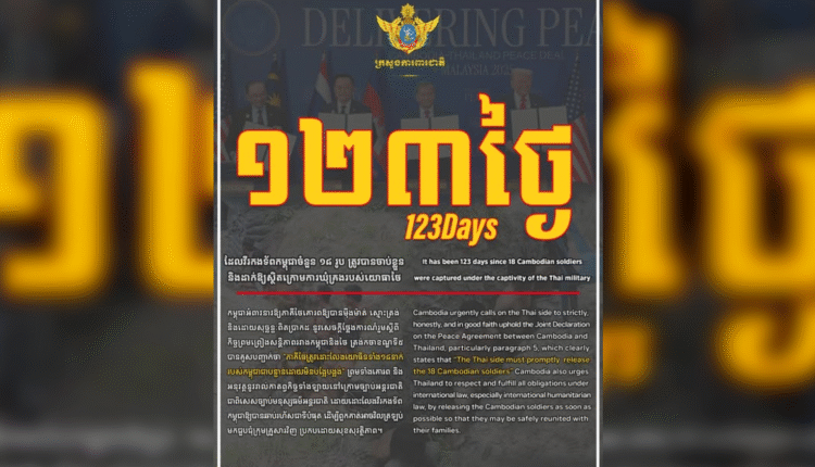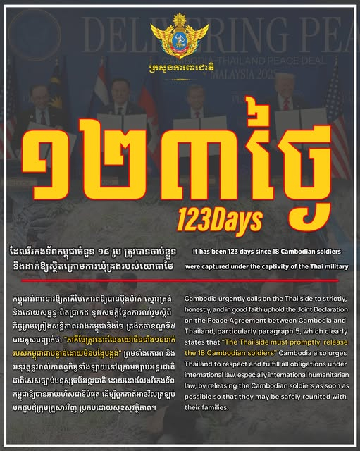 ថ្ងៃនេះជា ថ្ងៃទី១២៣ ហើយ ដែលវីរកងទ័ពកម្ពុជាចំនួន១៨រូប ត្រូវបានចាប់ខ្លួន និងដាក់ឱ្យស្ថិតក្រោមការឃុំគ្រងរបស់យោធាថៃ