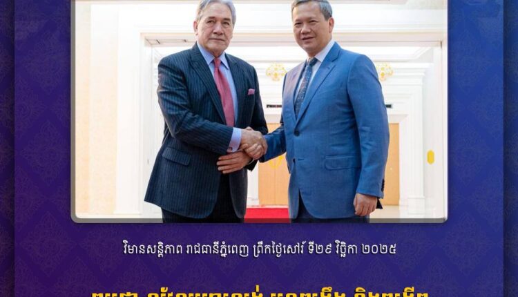 (ភ្នំពេញ)៖ នាព្រឹកថ្ងៃទី២៩ ខែវិច្ឆិកា ឆ្នាំ២០២៥, សម្តេចមហាបវរធិបតី ហ៊ុន ម៉ាណែត នាយករដ្ឋមន្ត្រី នៃព្រះរាជាណាចក្រកម្ពុជា បានអនុញ្ញាតឱ្យ លោក Winston Peters រដ្ឋមន្ត្រីការបរទេសនូវែលសេឡង់ និង គណៈប្រតិភូចូលជួបសម្ដែងការគួរសម និងពិភាក្សាការងារ នៅវិមានសន្តិភាព។