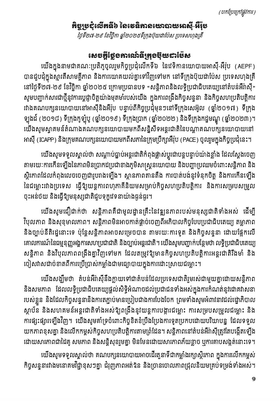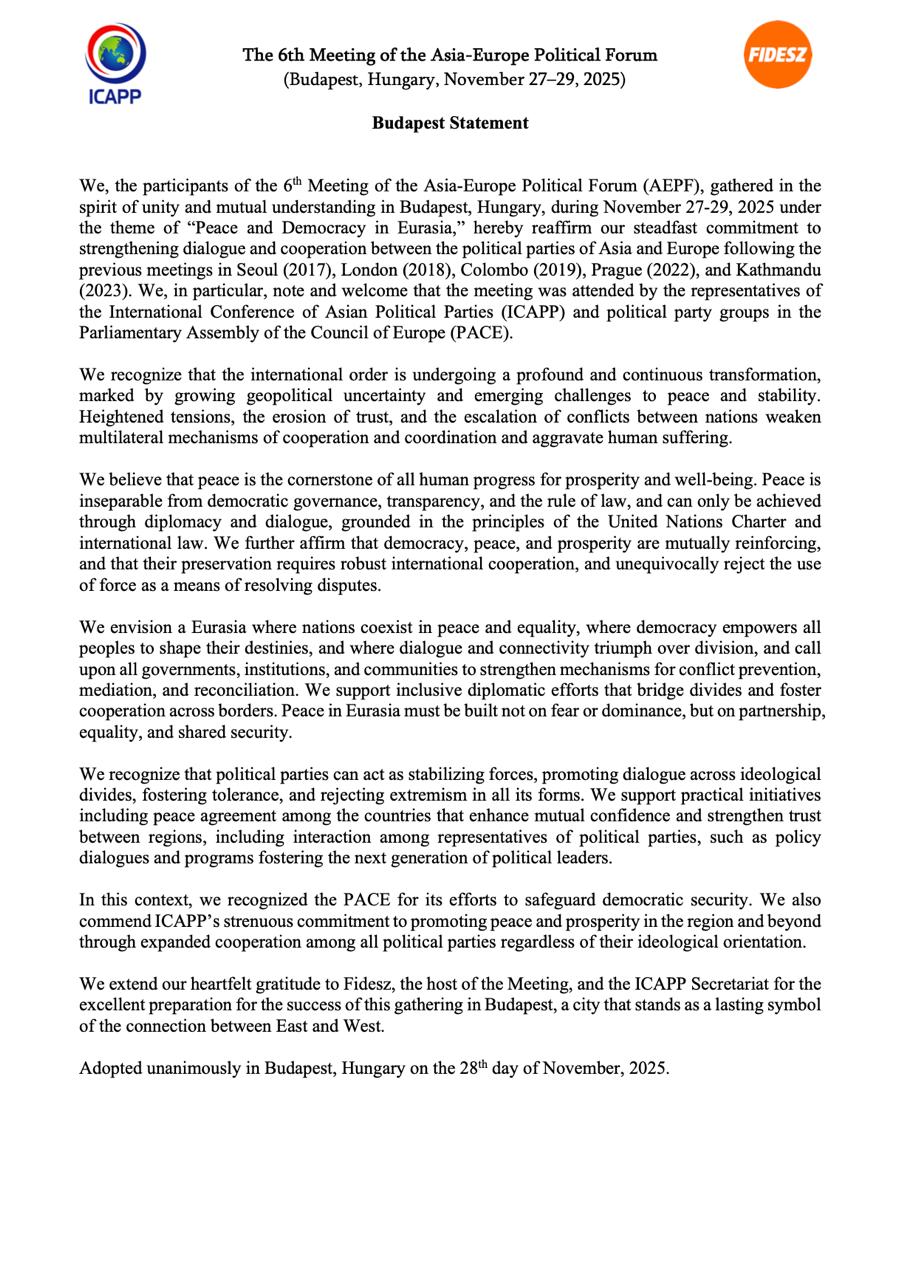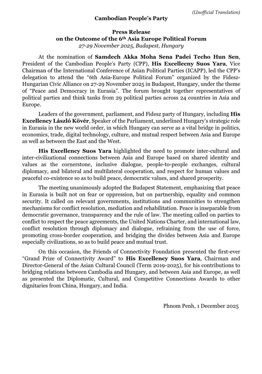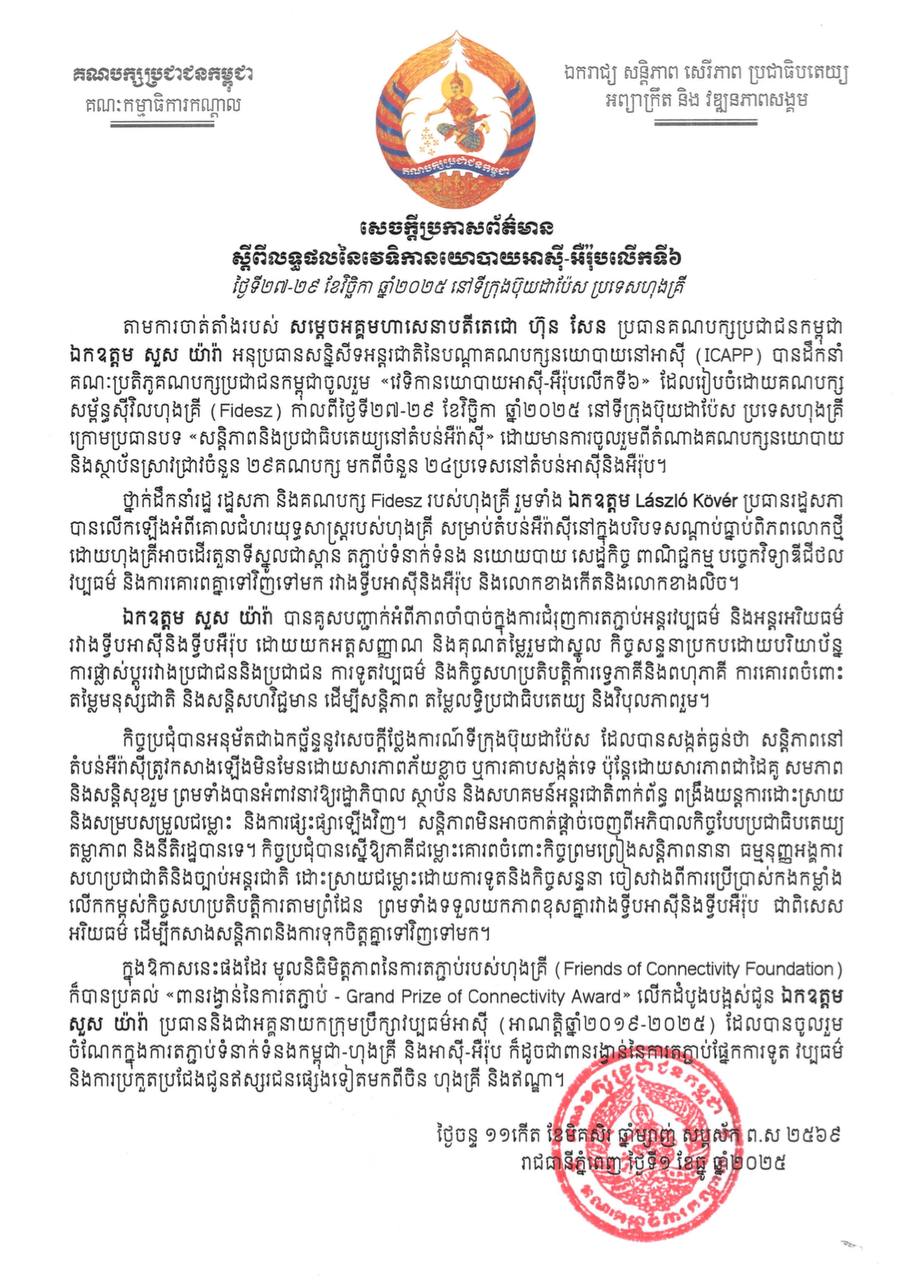 គណបក្សប្រជាជនកម្ពុជា ចេញសេចក្តីប្រកាសព័ត៌មានពីការចូលរួមវេទិកានយោបាយអាស៊ី-អឺរ៉ុប នៅហុងគ្រី និងទទួលបាន «ពានរង្វាន់នៃការតភ្ជាប់»