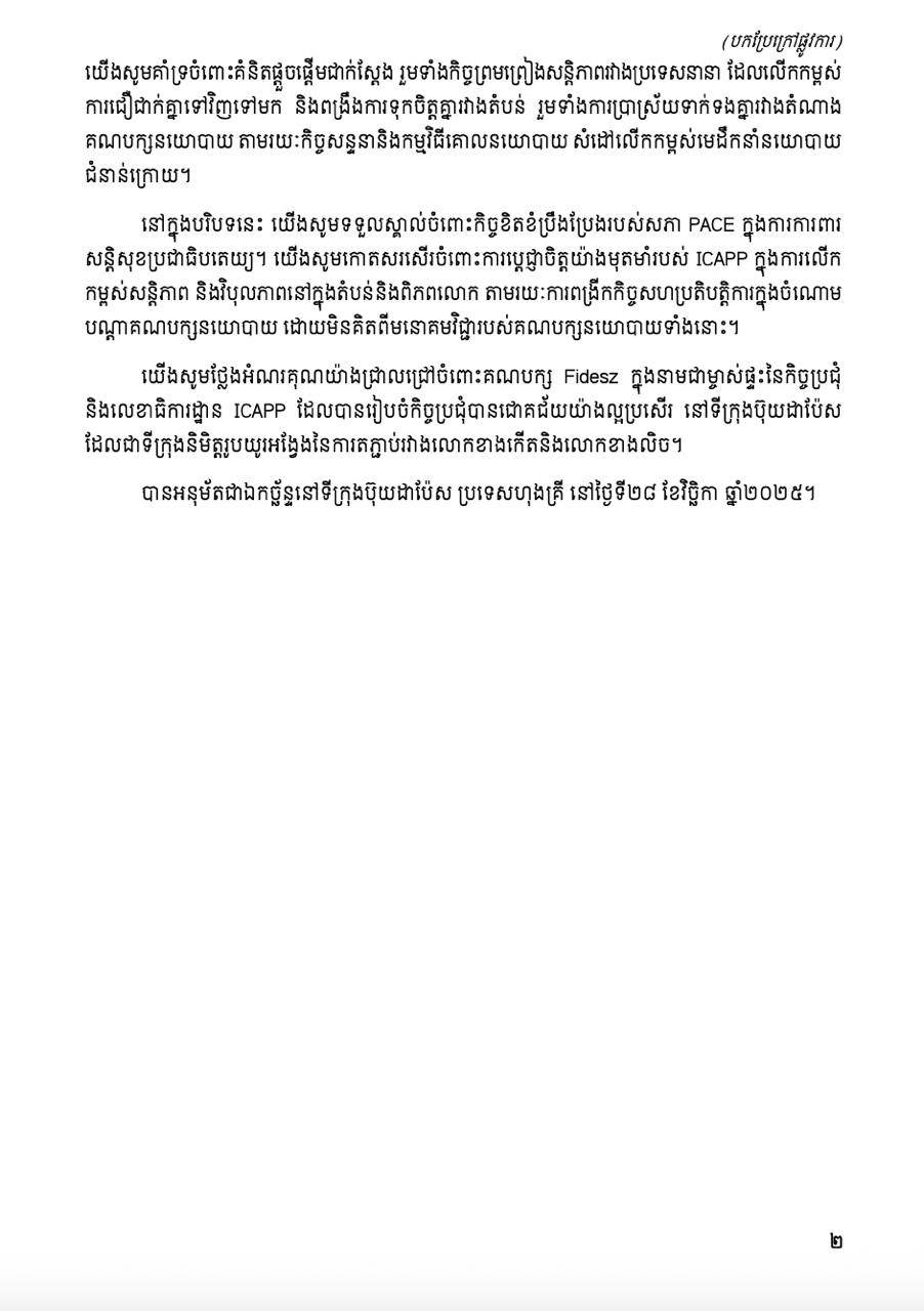 (ភ្នំពេញ)៖ តាមការចាត់តាំងរបស់សម្តេចតេជោ ហ៊ុន សែន ប្រធានគណបក្សប្រជាជនកម្ពុជា លោក សួស យ៉ារ៉ា អនុប្រធានសន្និសីទអន្តរជាតិនៃបណ្តាគណបក្សនយោបាយនៅអាស៊ី (ICAPP) បានដឹកនាំគណៈប្រតិភូគណបក្សប្រជាជនកម្ពុជាចូលរួម «វេទិកានយោបាយអាស៊ី-អឺរ៉ុបលើកទី៦» ដែលរៀបចំដោយគណបក្សសម្ព័ន្ធស៊ីវិលហុងគ្រី (Fidesz) កាលពីថ្ងៃទី២៧-២៩ ខែវិច្ឆិកា ឆ្នាំ២០២៥ នៅទីក្រុងប៊ុយដាប៉ែស ប្រទេសហុងគ្រី ក្រោមប្រធានបទ «សន្តិភាព និងប្រជាធិបតេយ្យនៅតំបន់អឺរ៉ាស៊ី» ដោយមានការចូលរួមពីតំណាងគណបក្សនយោបាយ និងស្ថាប័នស្រាវជ្រាវចំនួន ២៩គណបក្ស មកពីចំនួន ២៤ប្រទេស នៅតំបន់អាស៊ីនិងអឺរ៉ុប។