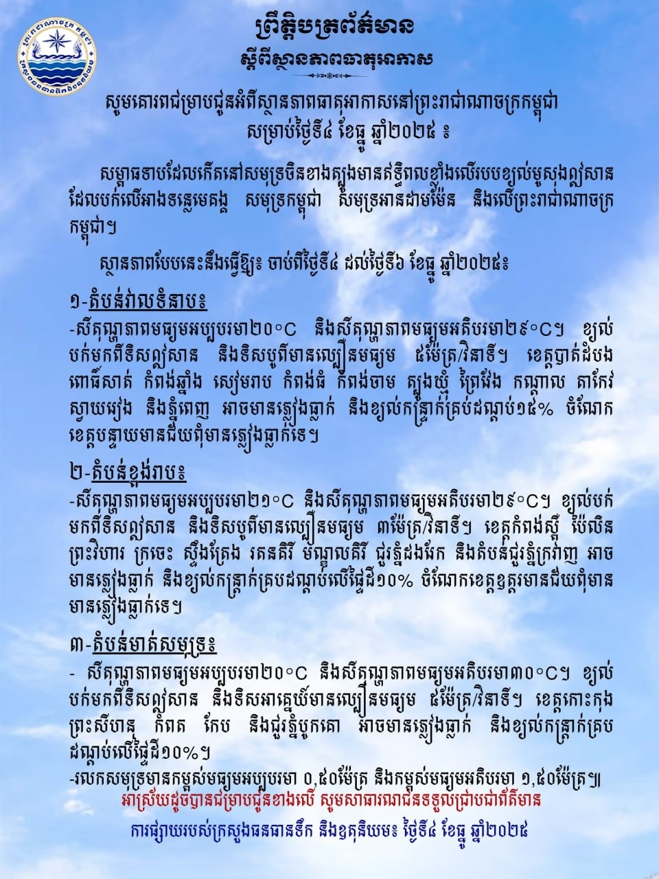 ក្រសួងធនធានទឹក ជូនដំណឹងអំពីស្ថានភាពធាតុអាកាសនៅកម្ពុជា សម្រាប់ថ្ងៃទី៤ ខែធ្នូ ឆ្នាំ២០២៥