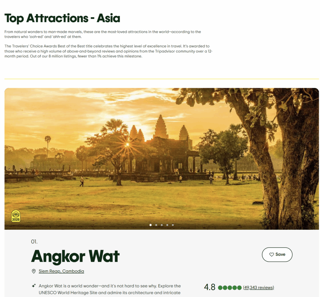 សូមជម្រាបថា ក្នុងចំណោមកន្លែងកំពូលទាំង៥ដែលទាក់ទាញទេសចរខ្លាំងបំផុតនៅអាស៊ីក្នុងឆ្នាំ២០២៥ របស់ Trip Advisor មានអង្គរវត្ត ឈរលេខ១, លេខ២បានទៅលើមហាកំផែងរបស់ចិន, ប្រាសាទ Taj Mahal របស់ឥណ្ឌាលេខ៣, ទីសក្ការបូជា Fushimi Inari-taisha របស់ជប៉ុន លេខ៤ និងសារមន្ទីរ War Remnants របស់វៀតណាម ជាប់លេខ៥។
