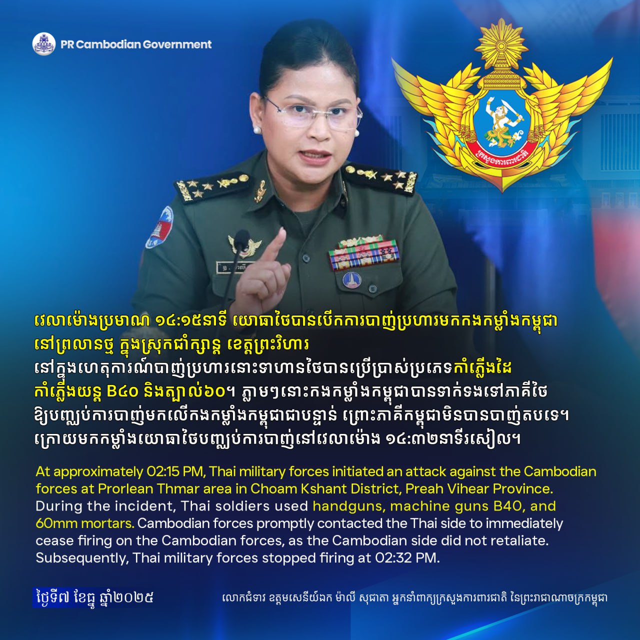 At approximately 02:15 PM, Thai military forces initiated an attack against the Cambodian forces at Prorlean Thmar area in Choam Kshant District, Preah Vihear Province. During the incident, Thai soldiers used handguns, machine guns B40, and 60mm mortars. Cambodian forces promptly contacted the Thai side to immediately cease firing on the Cambodian forces, as the Cambodian side did not retaliate. Subsequently, Thai military forces stopped firing at 02:32 PM.