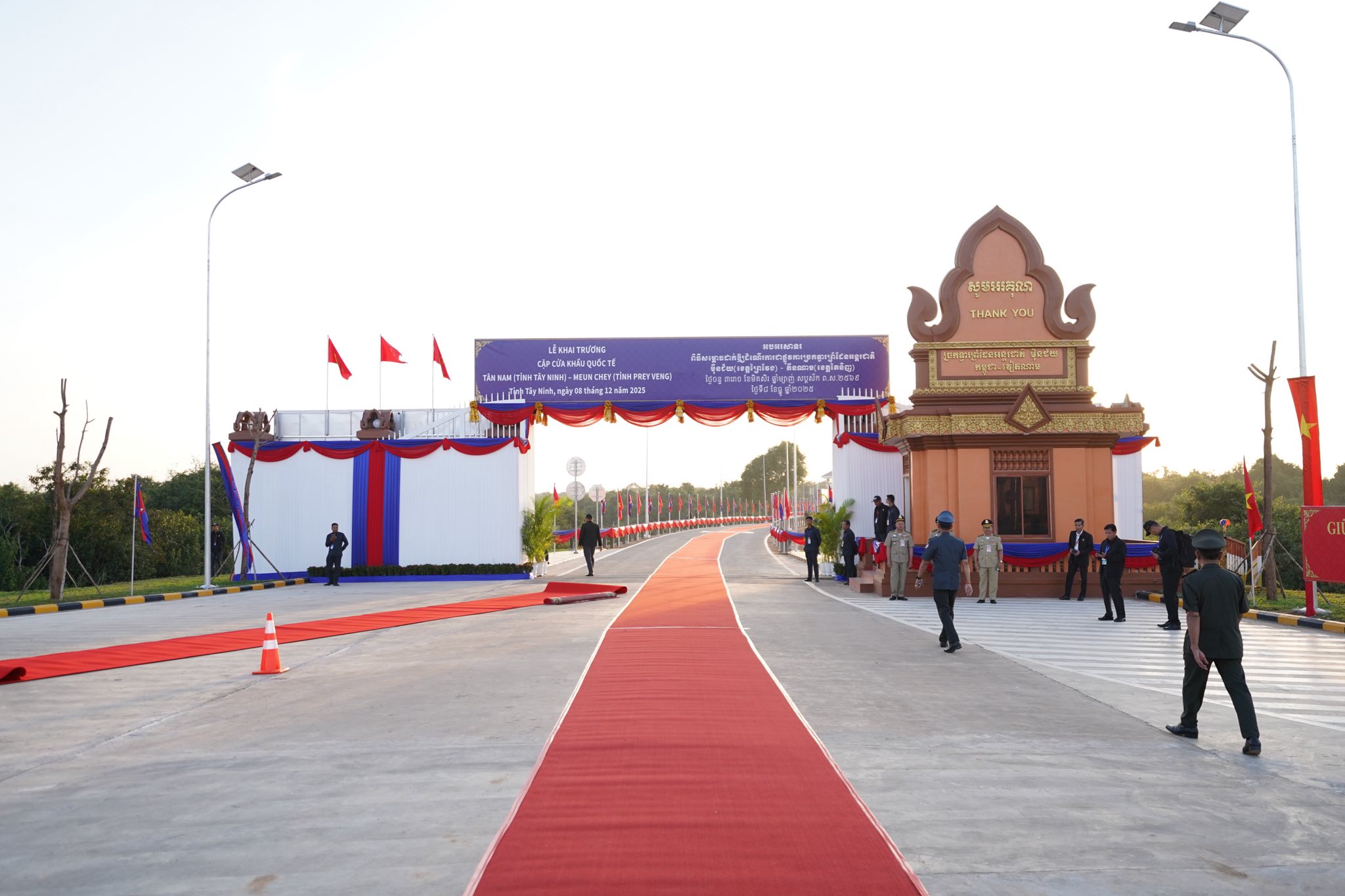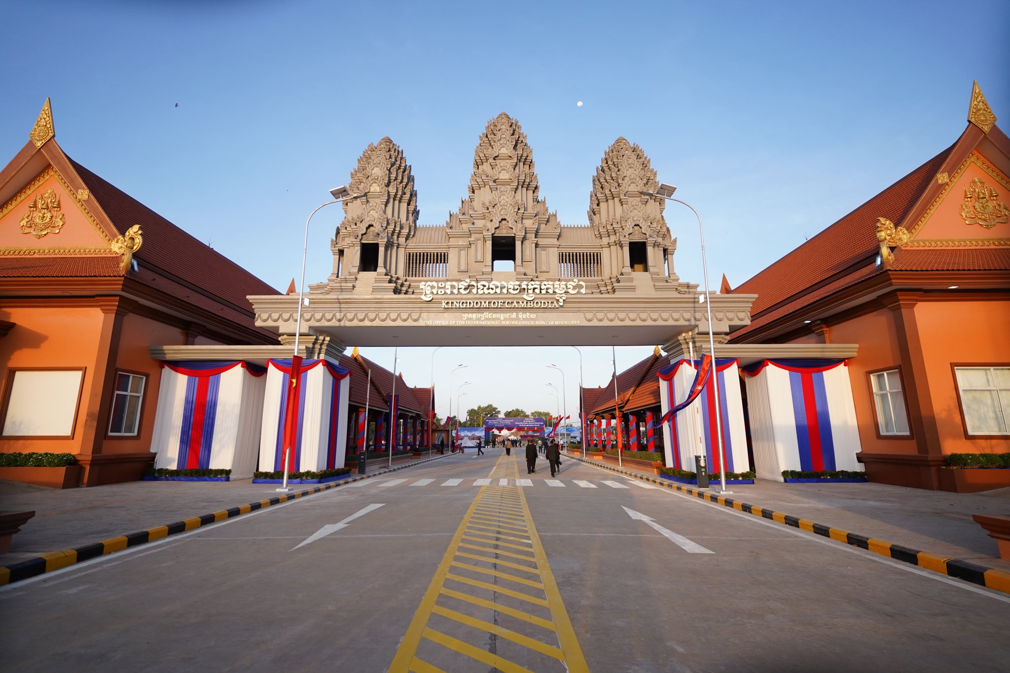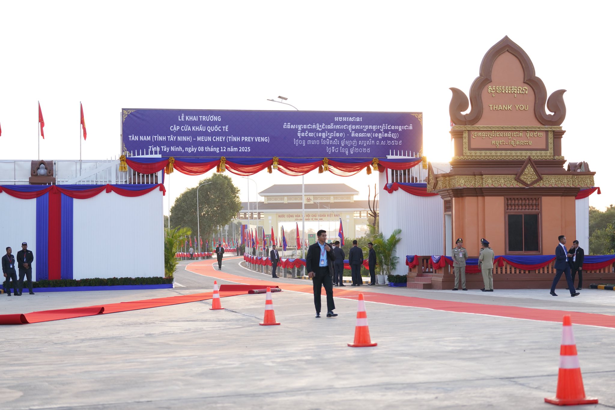 (ព្រៃវែង)៖ នៅព្រឹកថ្ងៃចន្ទ ៣រោច ខែមិគសិរ ឆ្នាំម្សាញ់ ព.ស.២៥៦៩ ត្រូវនឹងថ្ងៃទី៨ ខែធ្នូ ឆ្នាំ២០២៥នេះ សម្តេចមហាបវរធិបតី ហ៊ុន ម៉ាណែត នាយករដ្ឋមន្ត្រីកម្ពុជា និងលោក ផាម មិញជីញ នាយករដ្ឋមន្ត្រីវៀតណាម អញ្ជើញសម្ពោធដាក់ឱ្យដំណើរការជាផ្លូវការនូវច្រកទ្វារអន្តរជាតិម៉ឺនជ័យ-តឹនណាម។