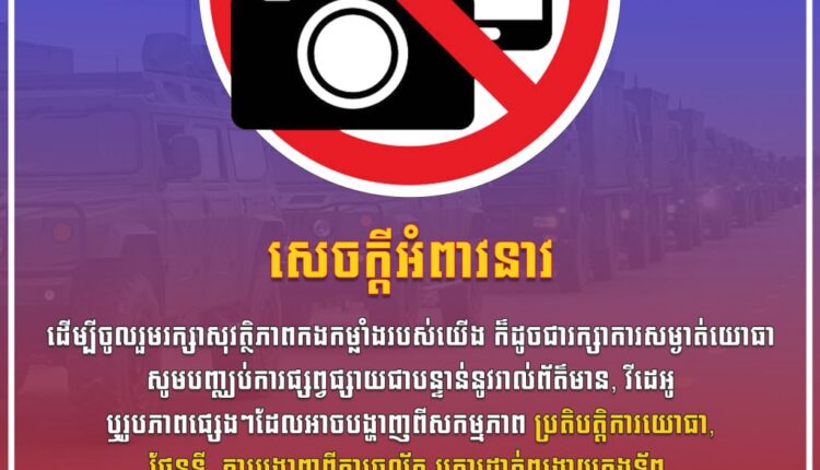 (ភ្នំពេញ)៖ ក្រសួងការពារជាតិកម្ពុជា អំពាវនាវឱ្យបញ្ឈប់ការផ្សព្វផ្សាយជាបន្ទាន់នូវរាល់ព័ត៌មាន, វីដេអូ ឬរូបភាពដែលអាចបង្ហាញពីសកម្មភាពប្រតិបត្តិការយោធា, ផែនទី, ការបង្ហាញពីការចល័ត ឬការដាក់ពង្រាយកងទ័ព, ទីតាំងឈរជើង, លេណដ្ឋាន (ត្រង់សេ), ជំរុំជម្រក, ការចល័តសព្វាវុធ, ផ្លូវផ្គត់ផ្គង់សម្ភារបរិក្ខារ ឬស្បៀងអាហាររបស់កងទ័ព តាមគ្រប់បណ្តាញទំនាក់ទំនងសង្គម ដូចជា Facebook, TikToK, Youtube ឬប្រព័ន្ធផ្សព្វផ្សាយផ្សេងៗទៀតជាដាច់ខាត ដើម្បីចូលរួមរក្សាសុវត្ថិភាពកងកម្លាំងរបស់យើង ក៏ដូចជារក្សាការសម្ងាត់យោធា៕