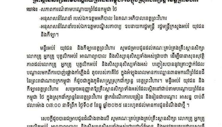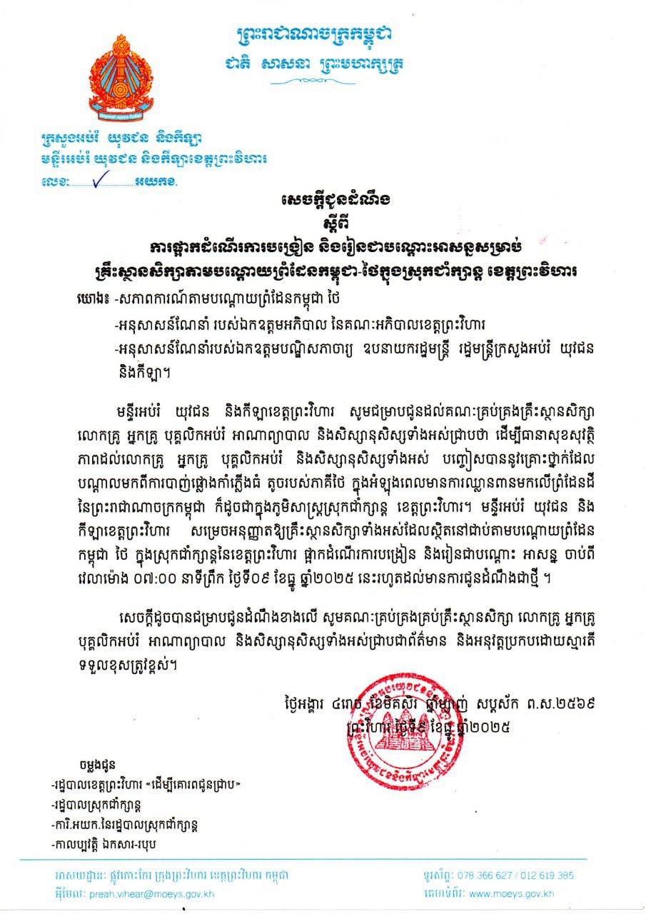 (ភ្នំពេញ)៖ ក្រសួងអប់រំ យុវជន និងកីឡា នៅថ្ងៃទី៩ ខែធ្នូ ឆ្នាំ២០២៥នេះ បានសម្រេចផ្អាកដំណើរការការបង្រៀន និងរៀន ជាបណ្តោះអាសន្នសម្រាប់គ្រឹះស្ថានសិក្សា តាមបណ្តោយព្រំដែនកម្ពុជា-ថៃក្នុងស្រុកជាំក្សាន្ត ខេត្តព្រះវិហារ។