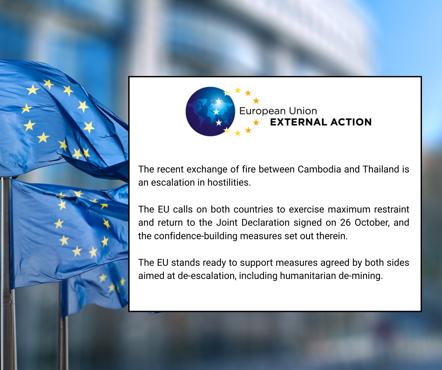 (ភ្នំពេញ)៖ ស្ថាប័នទទួលបន្ទុកកិច្ចការបរទេសរបស់សហភាពអឺរ៉ុប (EEAS) នៅថ្ងៃទី៩ ខែធ្នូ ឆ្នាំ២០២៥ បានចេញសេចក្ដីថ្លែងការណ៍ ទាក់ទិននឹងជម្លោះដោយប្រដាប់អាវុធ រវាងប្រទេសកម្ពុជា-ថៃ ស្តីពីការប៉ះទង្គិចគ្នា ដោយប្រដាប់អាវុធជាថ្មីរវាងកម្ពុជា-ថៃជាថ្មីនេះ គឺជាការកើនឡើងនូវអរិភាព។