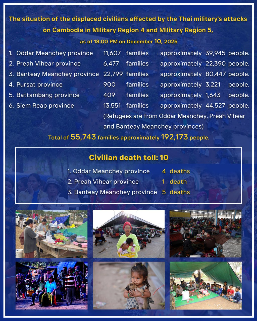 ក្រសួងការពារជាតិ៖ គិតត្រឹមថ្ងៃទី១០ ខែធ្នូ នៅក្នុងយោធភូមិភាគទី៤ និងយោធភូមិភាគទី៥ មានពលរដ្ឋភៀសសឹកជិត ២០ម៉ឺននាក់