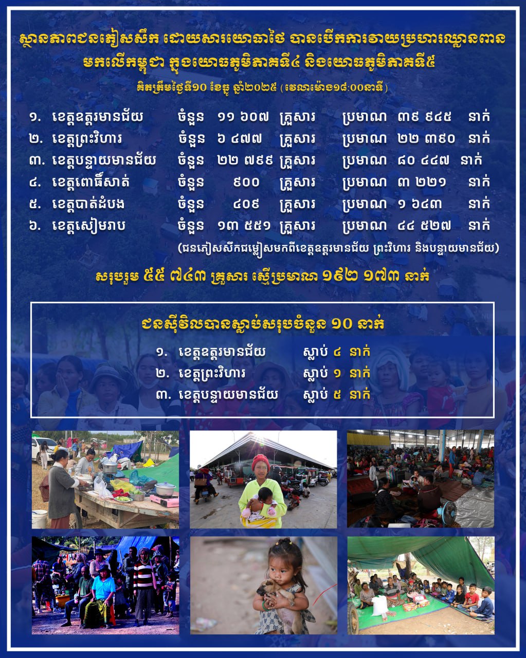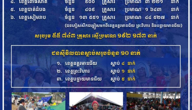 តាមរបាយការណ៍ បានឱ្យដឹងថា មានប្រជាពលរដ្ឋស៉ីវិលបានភៀសសឹកចំនួន ៥៥ ៧៤៣គ្រួសារ ស្មើប្រមាណ ១៩២ ១៧៣នាក់។ ក្នុងនោះមានជនស៉ីវិលចំនួន ១០នាក់ បានស្លាប់ដោយសារការឈ្លានពានរបស់កងទ័ពថៃ៕