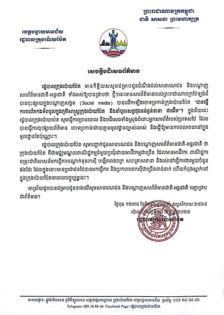 រដ្ឋបាលក្រុងប៉ោយប៉ែត កាលពីថ្ងៃទី១៧ ខែធ្នូ ឆ្នាំ២០២៥ម្សិលមិញនេះ បានចេញមកបដិសេធ និងច្រានចោលទាំងស្រុងចំពោះអ្នកសារព័ត៌របស់ប្រទេសថៃ ដែលបានចុះផ្សាយព័ត៌មានចោទប្រកាន់ថា ក្រុងប៉ោយប៉ែត បានធ្វើការចល័តកងទ័ពចូលក្នុងភូមិសាស្ត្រក្រុងប៉ោយប៉ែត និងនាំចូលសព្វាវុធធន់ធ្ងន់។ រដ្ឋបាលក្រុងប៉ោយប៉ែត ចាត់ទុកការចុះផ្សាយរបស់អ្នកសារព័ត៌មានថៃ គឺជាការចោទប្រកាន់ដោយគ្មានមូលដ្ឋានច្បាស់លាស់ និងធ្វើឱ្យមានការចលាចលនៅក្នុងមូលដ្ឋានតែប៉ុណ្ណោះ។