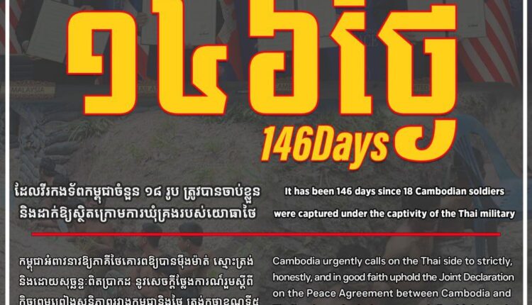 ថ្ងៃនេះជា ថ្ងៃទី១៤៦ ហើយ ដែលវីរកងទ័ពកម្ពុជាចំនួន១៨រូប ត្រូវបានចាប់ខ្លួន និងដាក់ឱ្យស្ថិតក្រោមការឃុំគ្រងរបស់យោធាថៃ