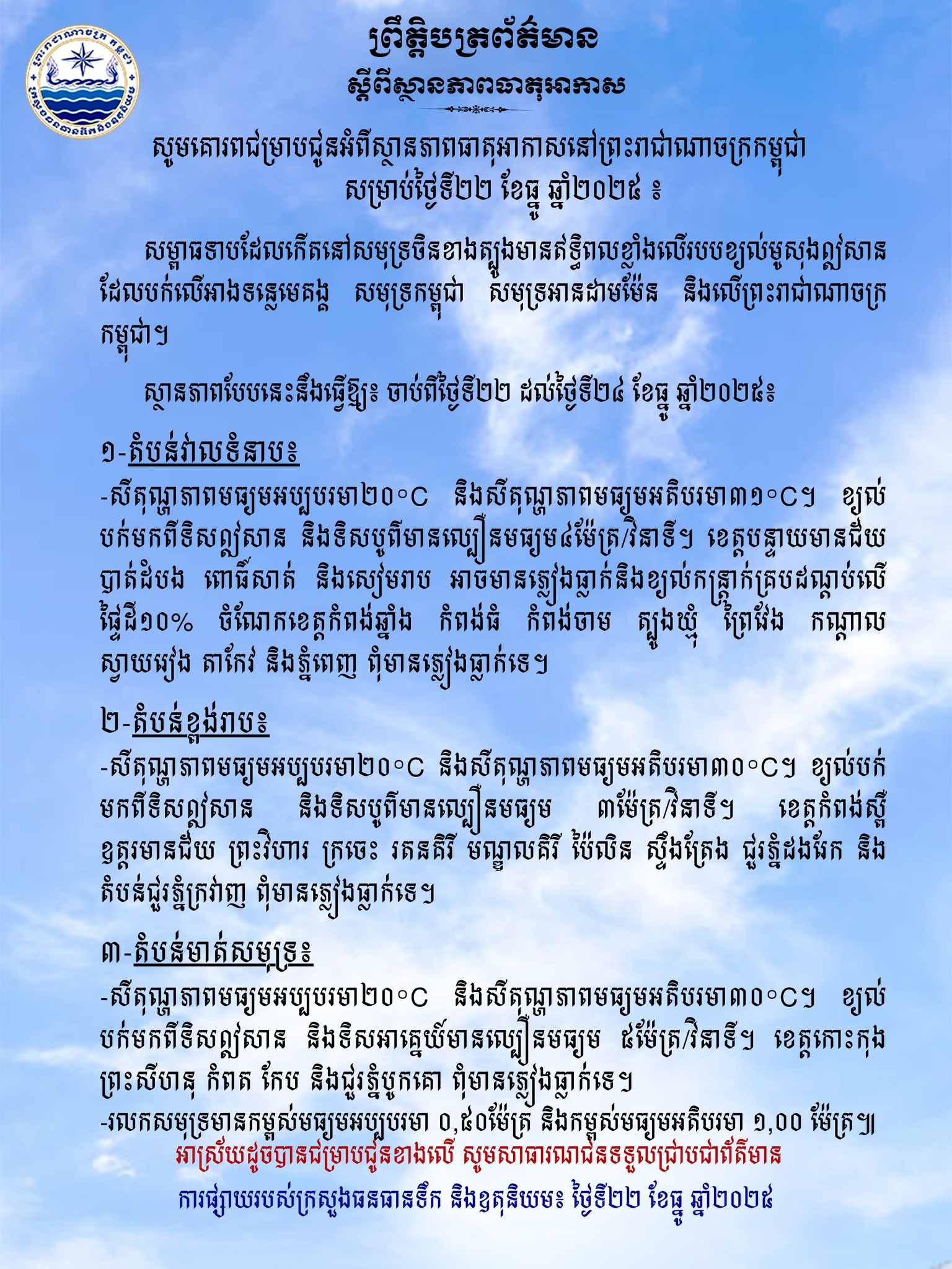 ក្រសួងធនធានទឹក ជូនដំណឹងអំពីស្ថានភាពធាតុអាកាសនៅកម្ពុជា សម្រាប់ថ្ងៃទី២២ ខែធ្នូ ឆ្នាំ២០២៥